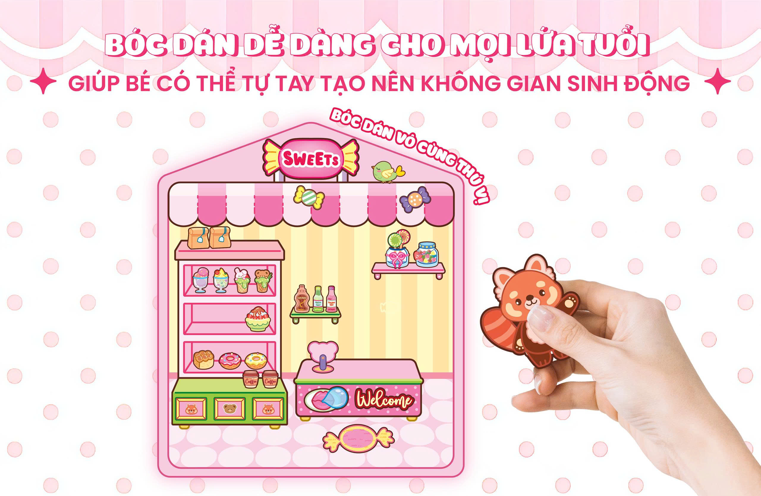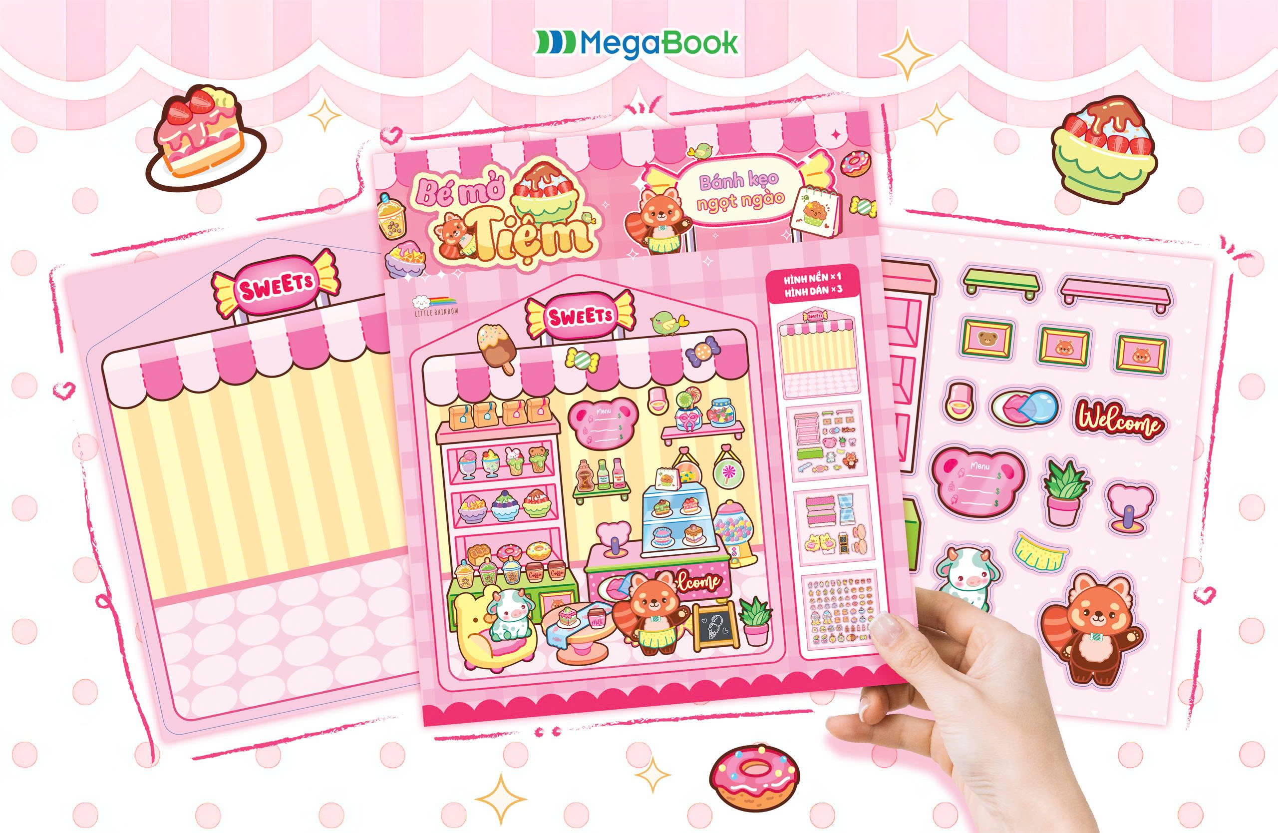 Mời bạn khám phá bộ Sách Bóc Dán Bé Mở Tiệm độc đáo, trò chơi bóc dán tuyệt vời cho mọi lứa tuổi! Bộ sách gồm 5 cuốn với 5 chủ đề siêu đáng yêu như Cắt tóc thời trang, Tạp hoá 24h, và Bánh kẹo ngọt ngào. Mỗi cuốn là một không gian 3D sống động, giúp bé tha hồ nhập vai thành cô/cậu chủ tài ba. Với hơn 90+ Sticker bóc dán trong suốt đi kèm, bé có thể tự tay trang trí, kiến tạo tiệm kinh doanh mơ ước.