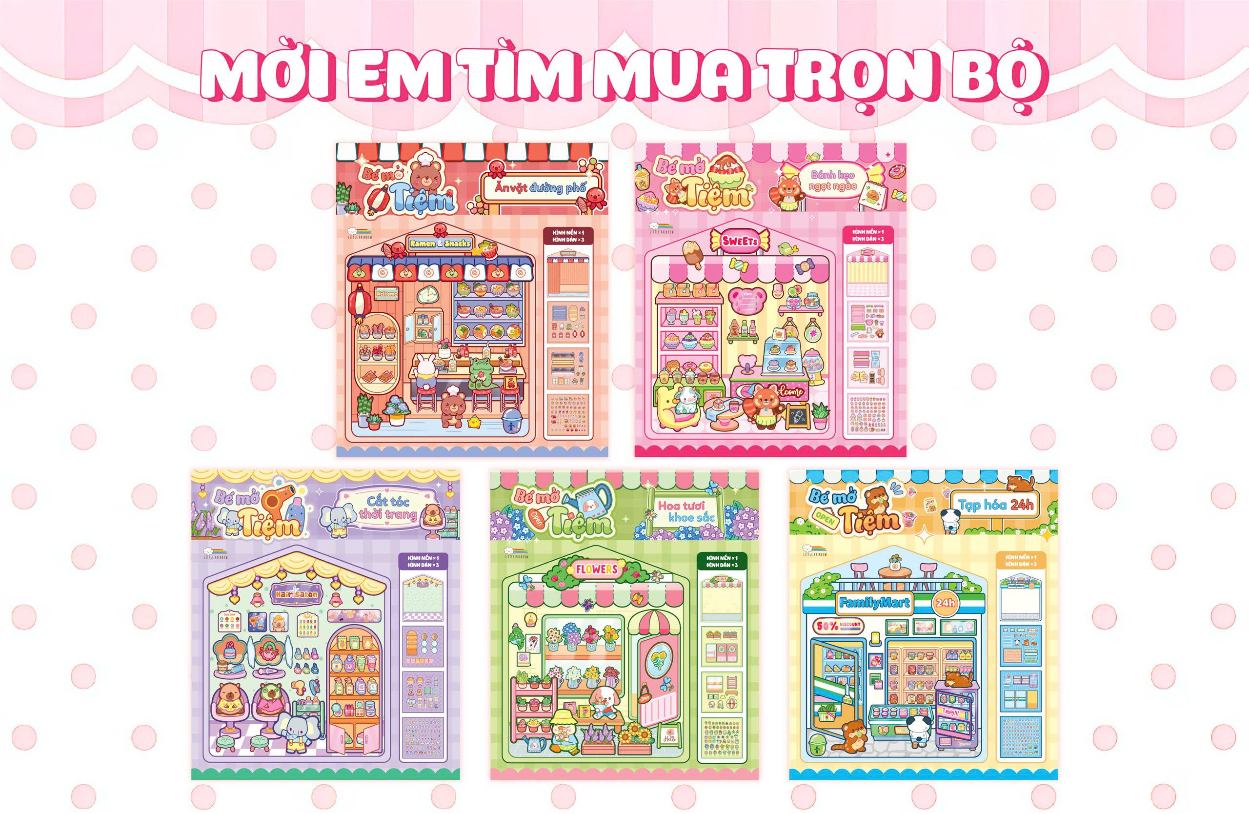 Chủ đề đa dạng: Bộ 5 cuốn với 5 chủ đề khác nhau (Ăn vặt, Bánh kẹo, Cắt tóc, Tạp hoá, Hoa tươi), mang lại trải nghiệm phong phú.
