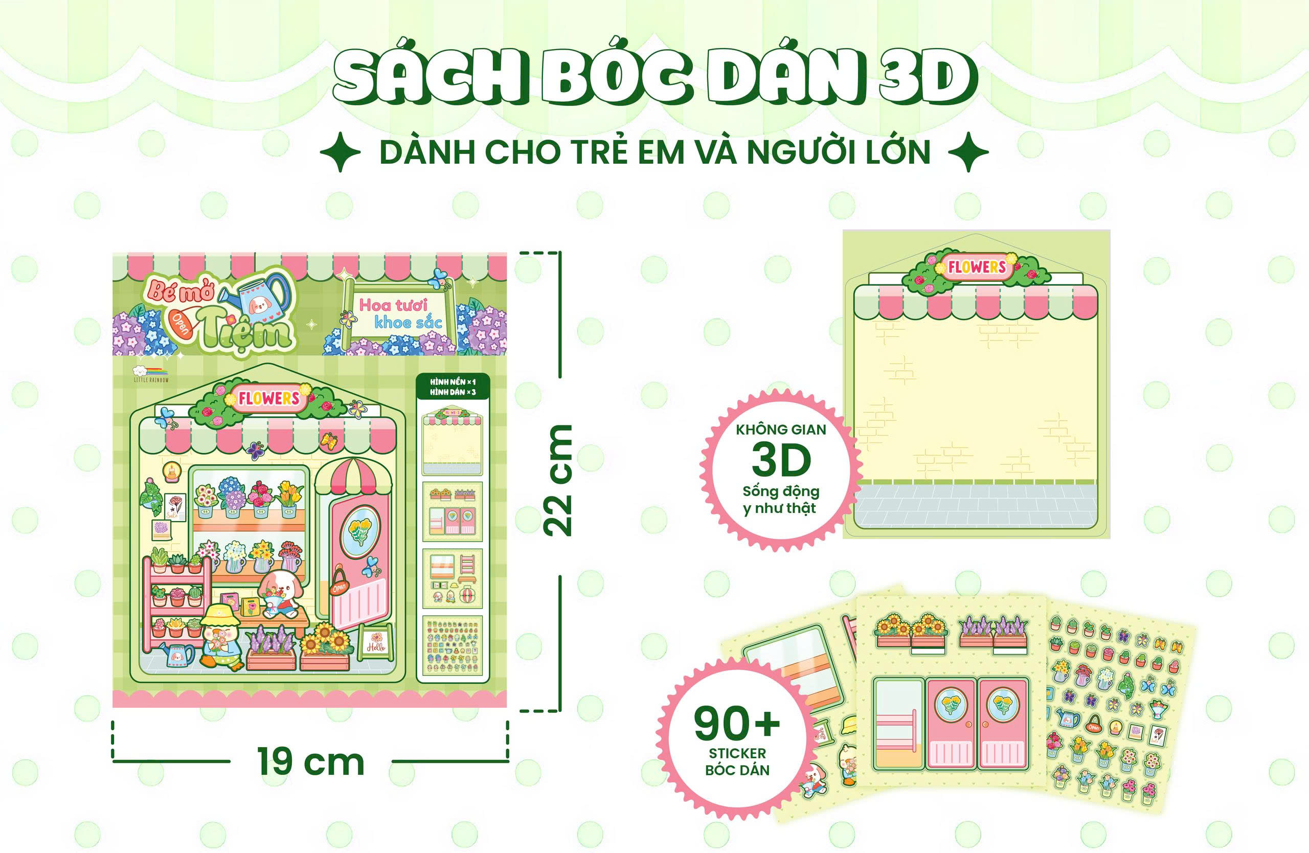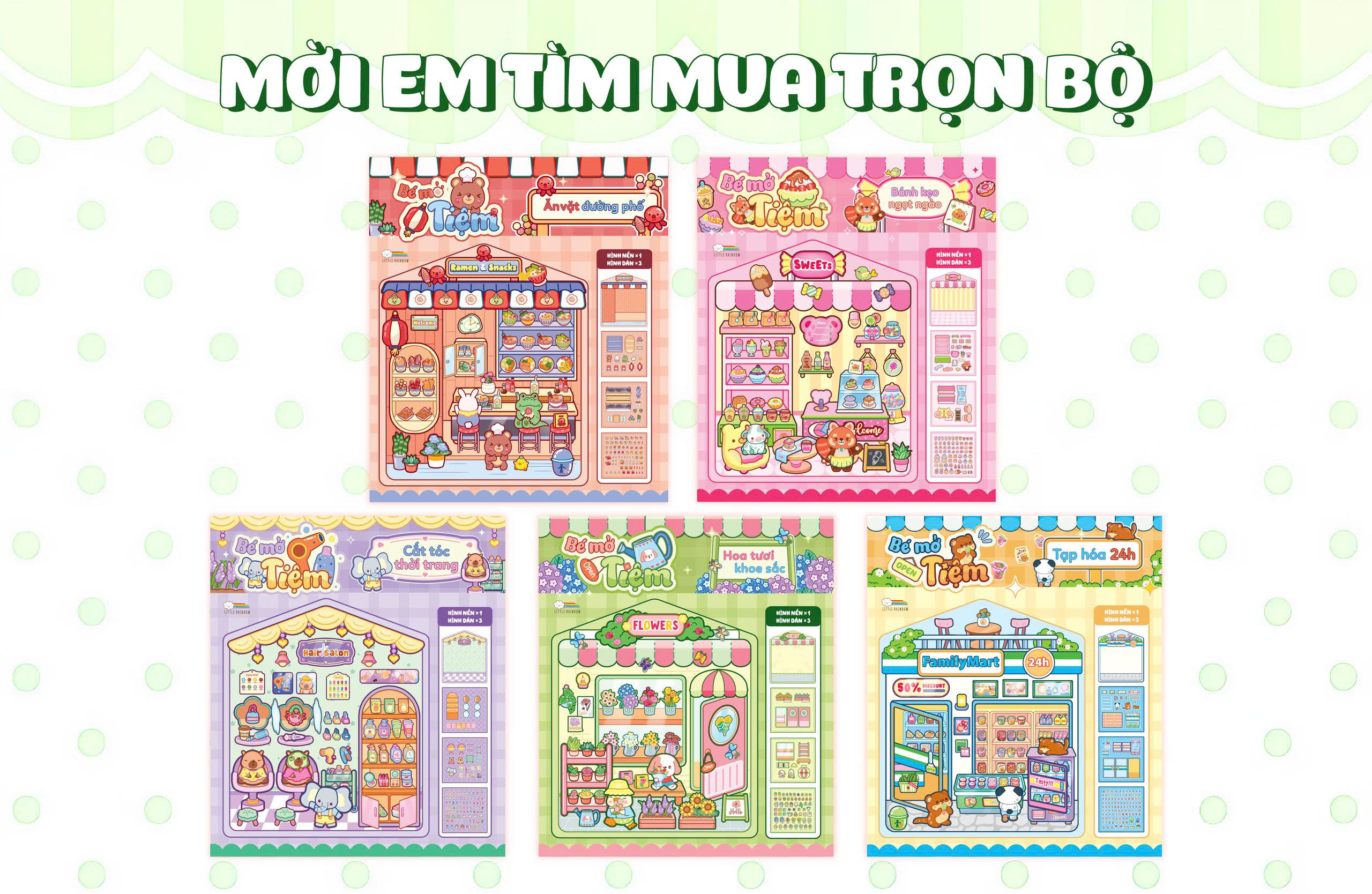 Mời bạn khám phá bộ Sách Bóc Dán Bé Mở Tiệm độc đáo, trò chơi bóc dán tuyệt vời cho mọi lứa tuổi! Bộ sách gồm 5 cuốn với 5 chủ đề siêu đáng yêu như Cắt tóc thời trang, Tạp hoá 24h, và Bánh kẹo ngọt ngào. Mỗi cuốn là một không gian 3D sống động, giúp bé tha hồ nhập vai thành cô/cậu chủ tài ba. Với hơn 90+ Sticker bóc dán trong suốt đi kèm, bé có thể tự tay trang trí, kiến tạo tiệm kinh doanh mơ ước.