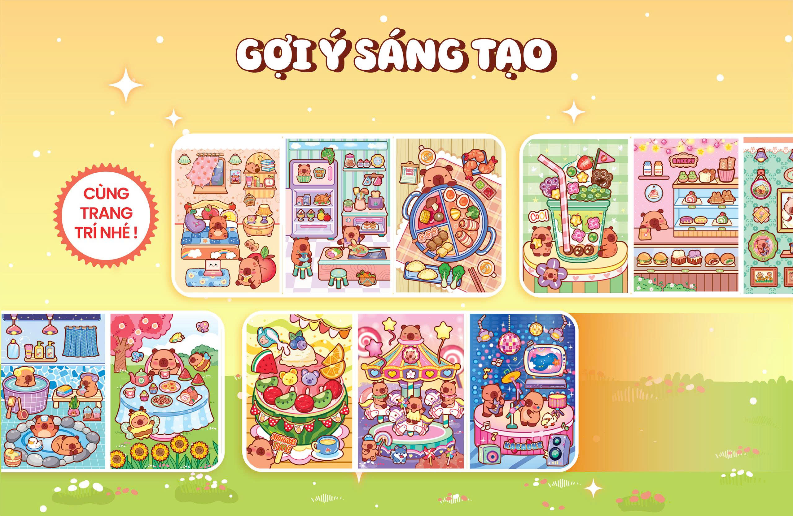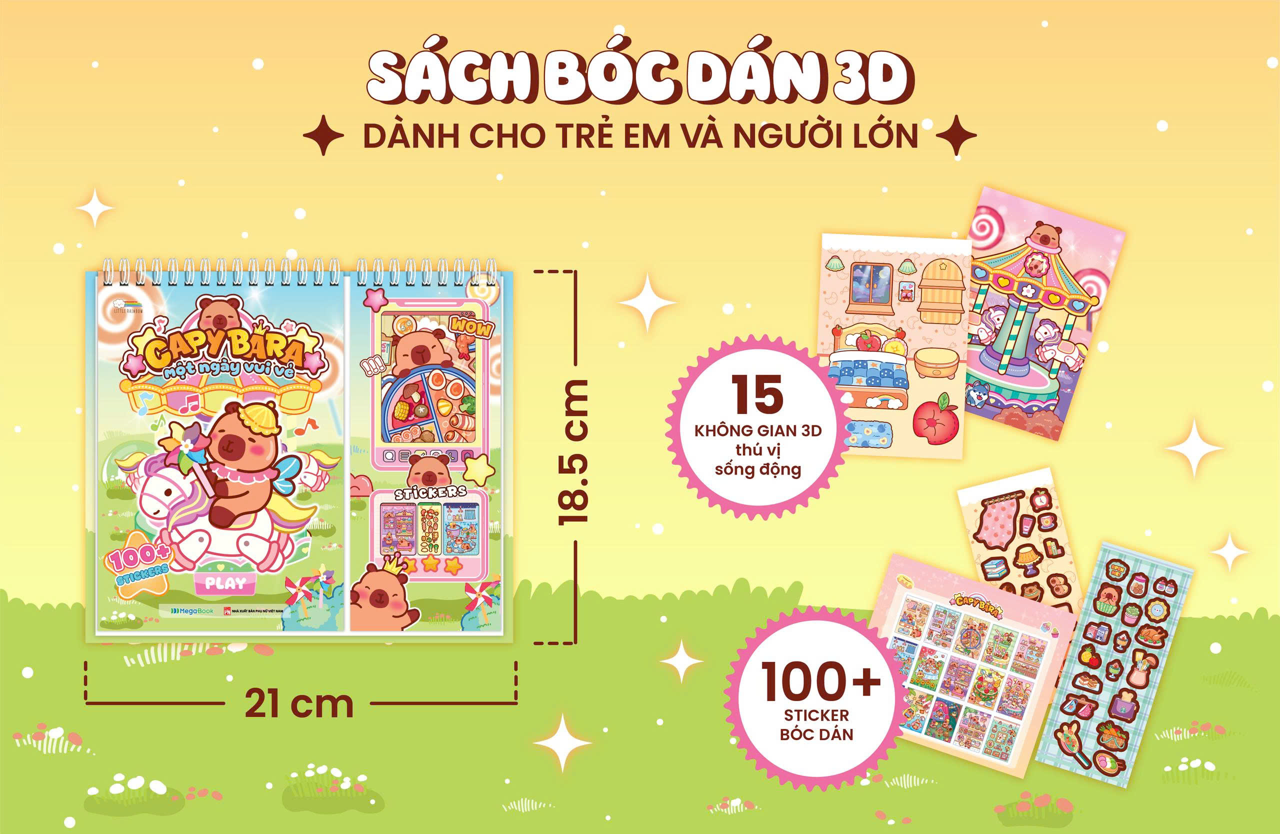 CAPYBARA – Một ngày vui vẻ là cuốn sách bóc dán 3D đáng yêu, đưa bé theo chân chú Capybara khám phá những khoảnh khắc vui nhộn trong ngày. Với thiết kế lật mở dạng lò xo thông minh, trang không gian 3D và trang sticker được đặt song song, giúp bé dễ dàng bóc – dán – sáng tạo mà không bị rối. Hình ảnh sinh động, màu sắc tươi sáng cùng hơn 100 sticker ngộ nghĩnh sẽ mang đến cho bé những giờ chơi vừa vui vừa học, kích thích trí tưởng tượng và khả năng quan sát.