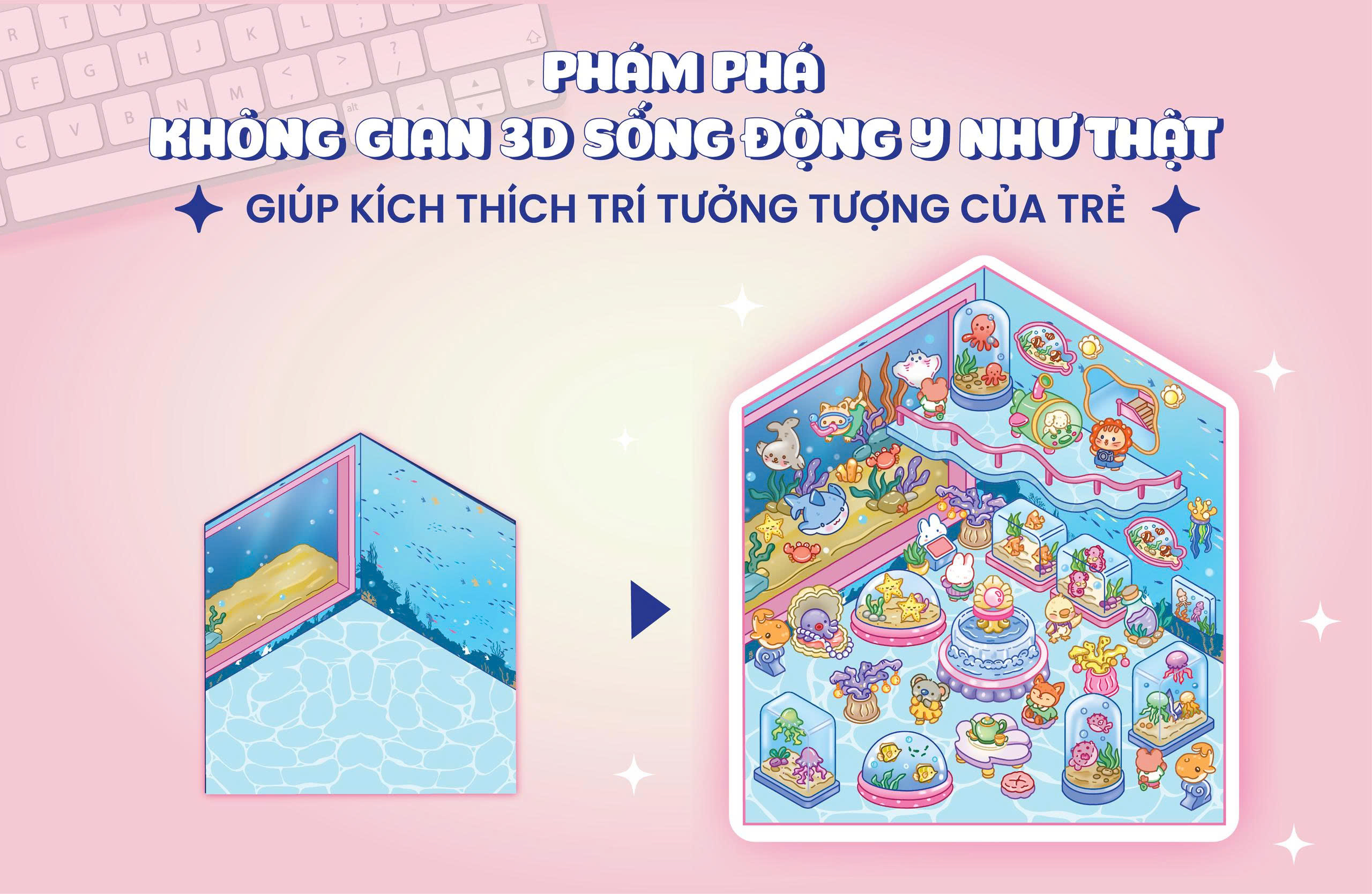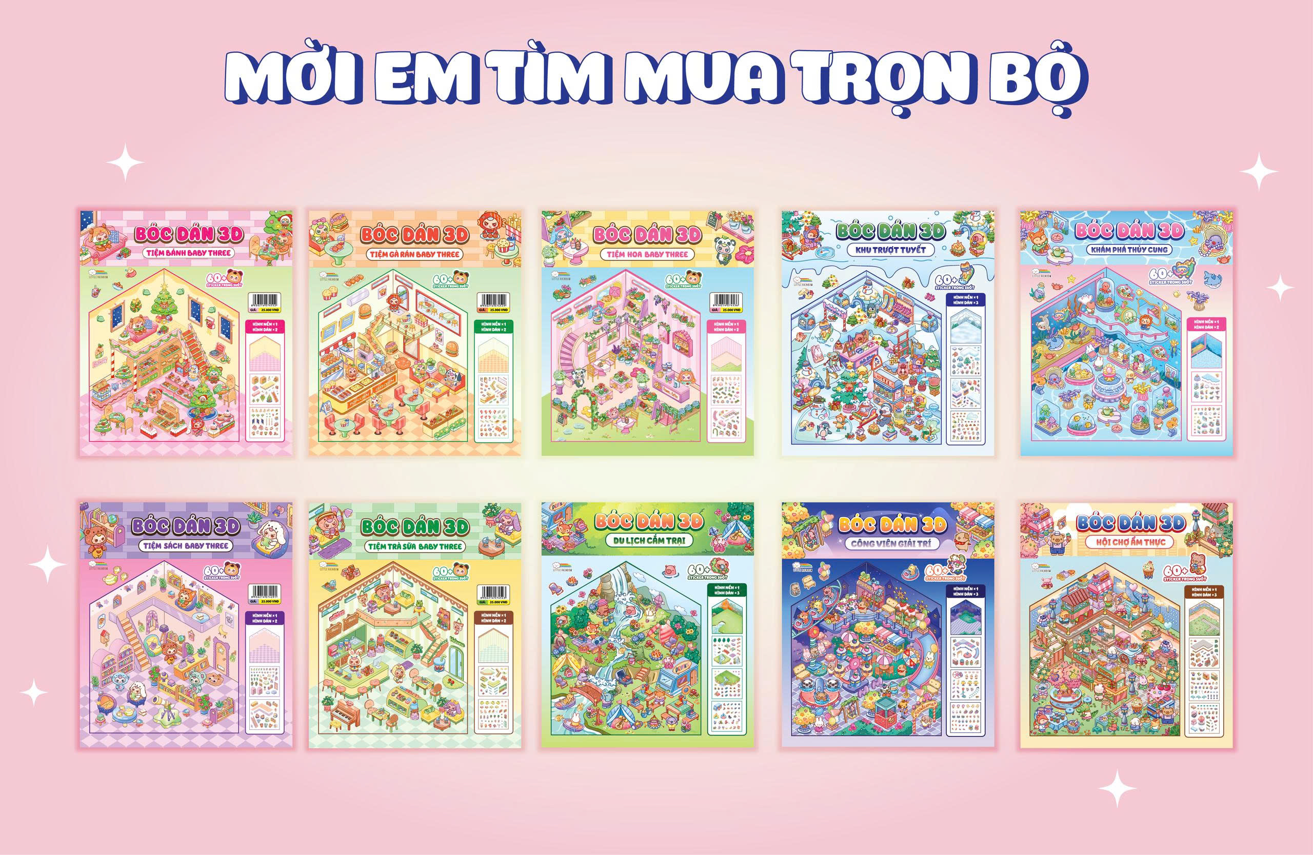 Mang cả không gian nghệ thuật sống động vào tay bé với Combo 10 cuốn Bóc dán 3D! Không cần cắt dán phức tạp, các bạn nhỏ vẫn có thể tạo nên những mô hình tiệm trà sữa, tiệm bánh, khu trượt tuyết, khám phá thủy cung,... với thiết kế đa tầng và hiệu ứng thị giác chân thực. Từng chi tiết được chăm chút tỉ mỉ, giúp các bạn nhỏ tự do sáng tạo, decor không gian theo phong cách hiện đại và đầy cảm hứng. Đây không chỉ là món quà hoàn hảo cho những ai yêu DIY, mà còn là điểm nhấn độc đáo cho góc học tập của bé.