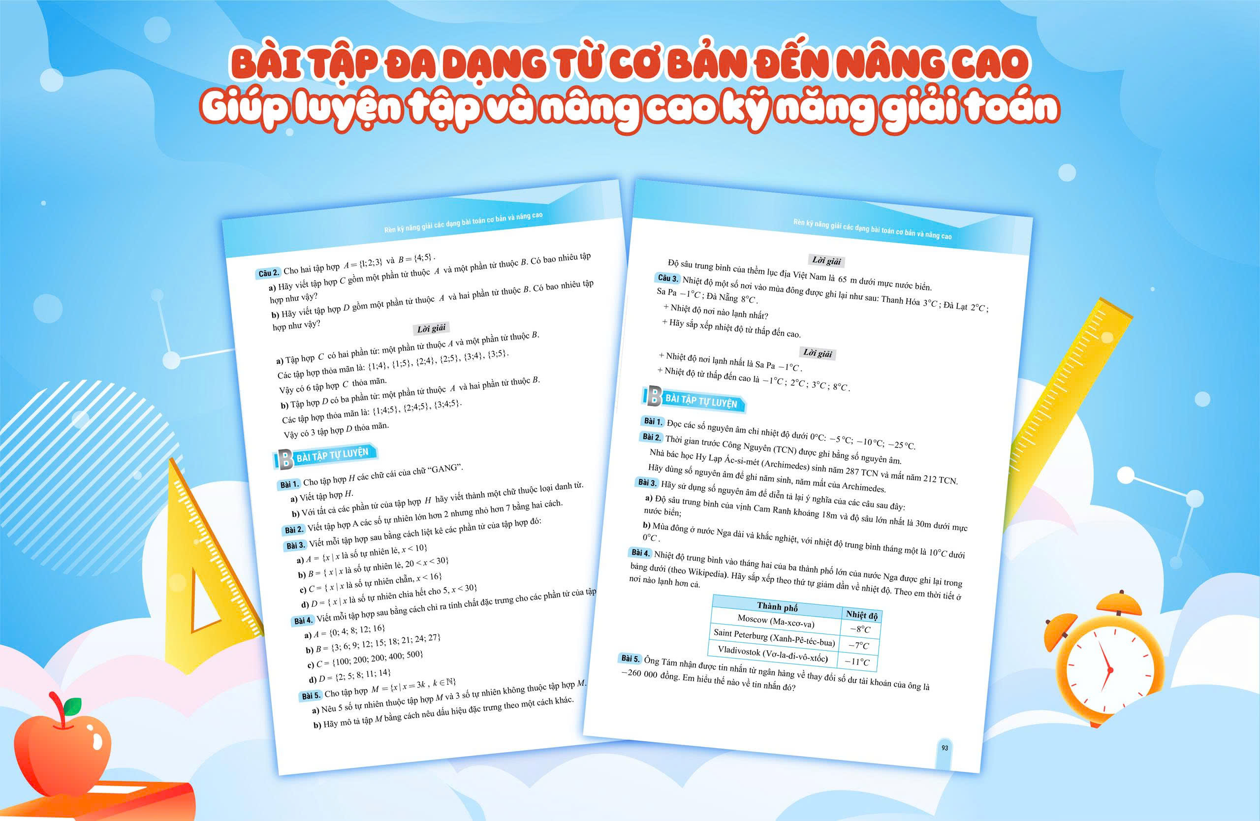 - Tập 1 gồm 3 chương với 24 chủ đề bám sát chương trình mới của Bộ Giáo dục và Đào tạo như: Số tự nhiên, Số nguyên, phân số.