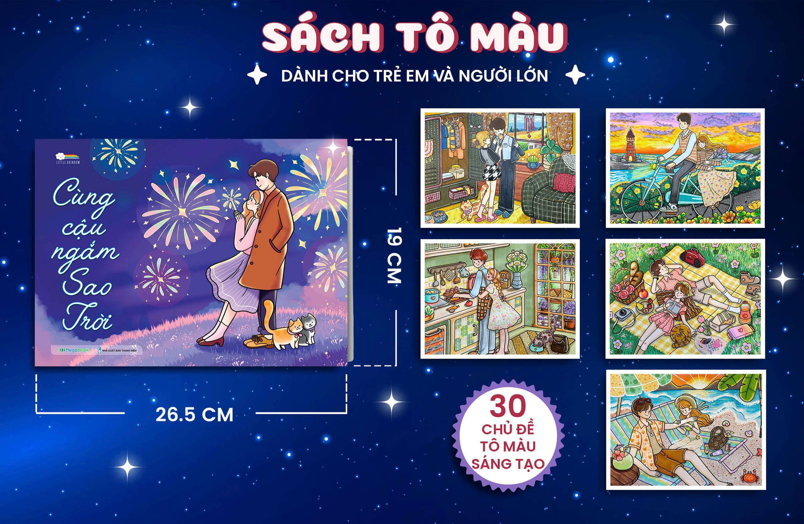"Cùng Cậu Ngắm Sao Trời" – cuốn sách tô màu dành cho những trái tim yêu! Với 30 bức tranh là 30 mảnh ghép tình yêu, bạn sẽ được đắm chìm trong hành trình đầy cảm xúc qua từng nét vẽ, từng bức tranh. Mỗi bức tranh đều đi kèm những câu nói ngọt ngào, sâu lắng, như những bản tình ca riêng dành cho bạn. Đặc biệt, sách có tặng kèm các sticker siêu đáng yêu. Đây không chỉ là một cuốn sách, mà còn là món quà để các bạn cùng người thương tô màu vun đắp yêu thương, viết nên câu chuyện tình của riêng bạn.