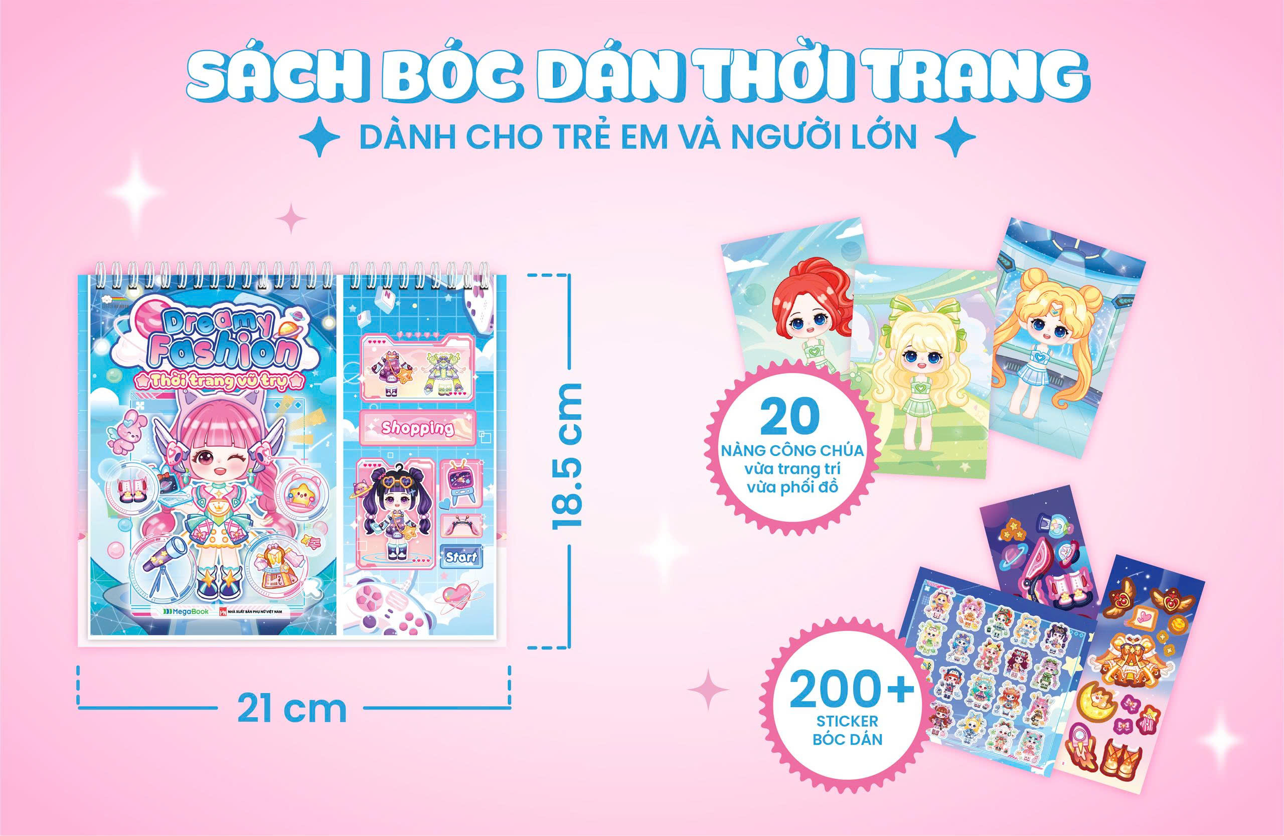 Dreamy Fashion - Thời trang vũ trụ là cuốn sách bóc dán sticker thời trang được thiết kế dạng lò xo lật mở tiện lợi, cho phép trang hình công chúa và trang sticker luôn nằm cùng một mặt. Nhờ đó, các bé có thể dễ dàng vừa xem mẫu công chúa, vừa chọn sticker để phối đồ mà không cần lật trang liên tục. Với 20 nàng công chúa xinh xắn, hơn 200+ sticker thời trang các bé được thỏa sức bóc dán phối đồ cho các công chúa, cuốn sách mở ra một thế giới thời trang mơ mộng, nơi bé tự do thể hiện gu thẩm mỹ và trí tưởng tượng của mình.