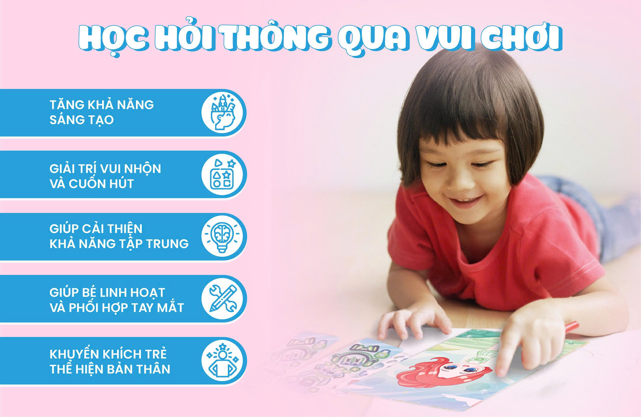 Giúp bé rèn sự tập trung, khéo léo: Với nhiều hình ảnh công chúa bắt mắt cùng các hoạt động đa dạng giúp bé vui chơi thỏa thích rèn luyện khả năng tập trung và khéo léo của đôi tay, giảm thời gian tiếp xúc màn hình