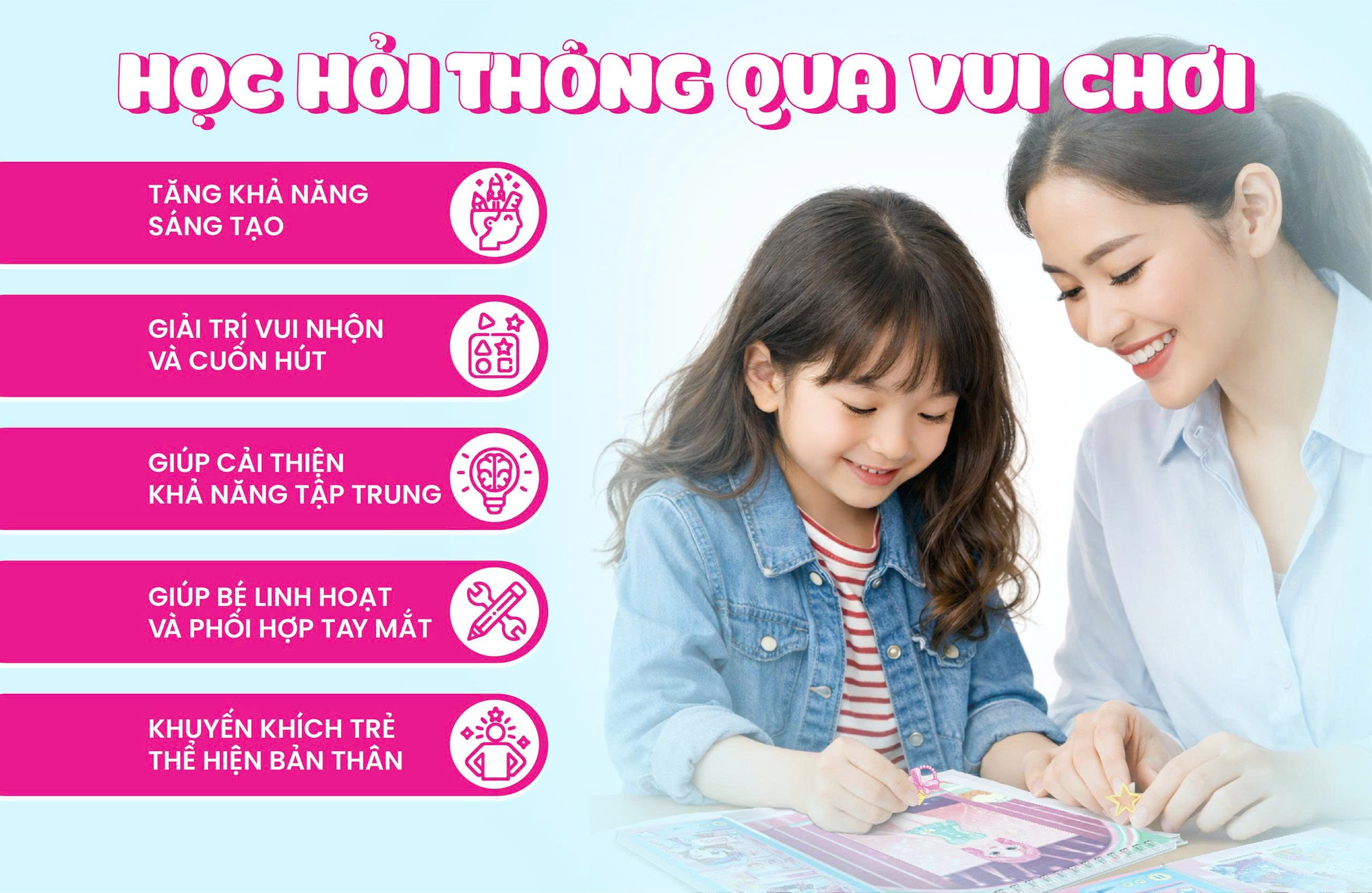 Giúp bé rèn sự tập trung, khéo léo: Với nhiều hình ảnh công chúa, thần tượng idol bắt mắt cùng các hoạt động đa dạng giúp bé vui chơi thỏa thích rèn luyện khả năng tập trung và khéo léo của đôi tay, giảm thời gian tiếp xúc màn hình