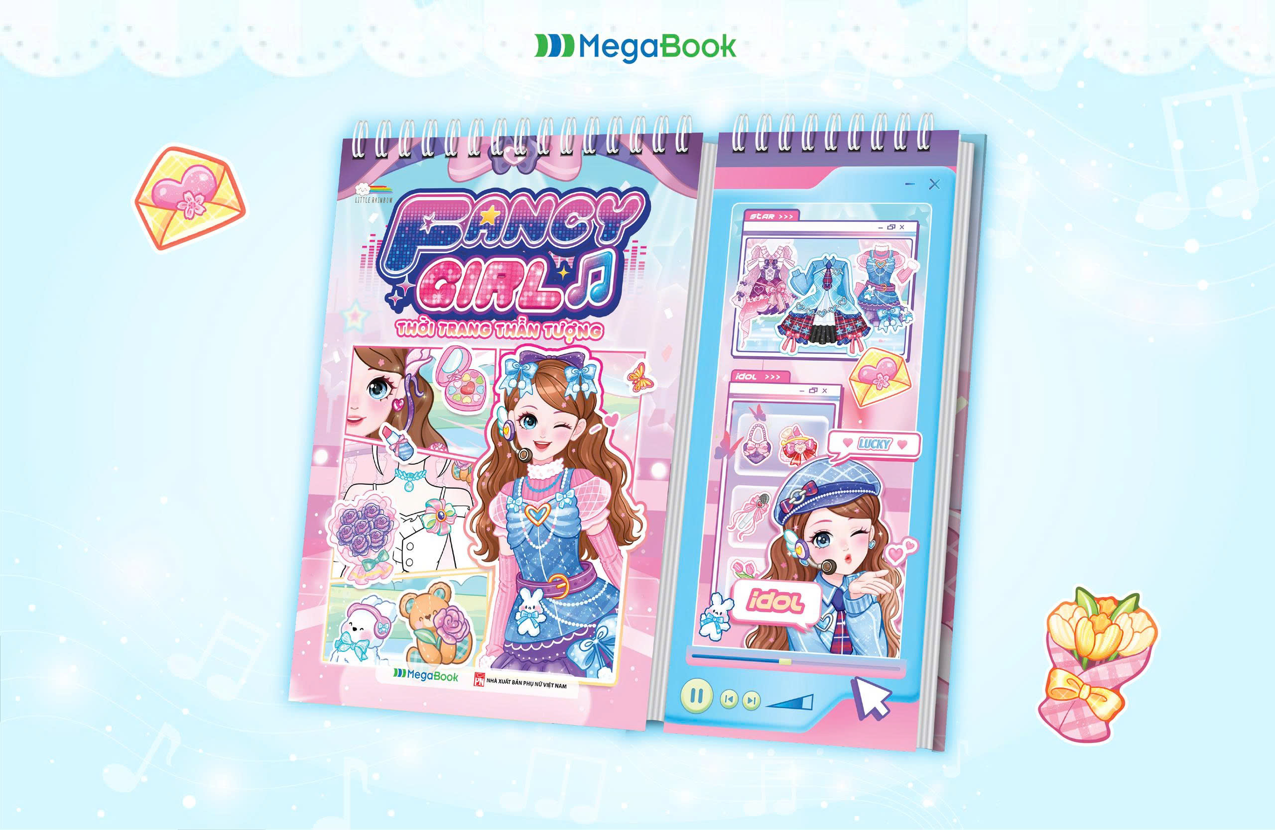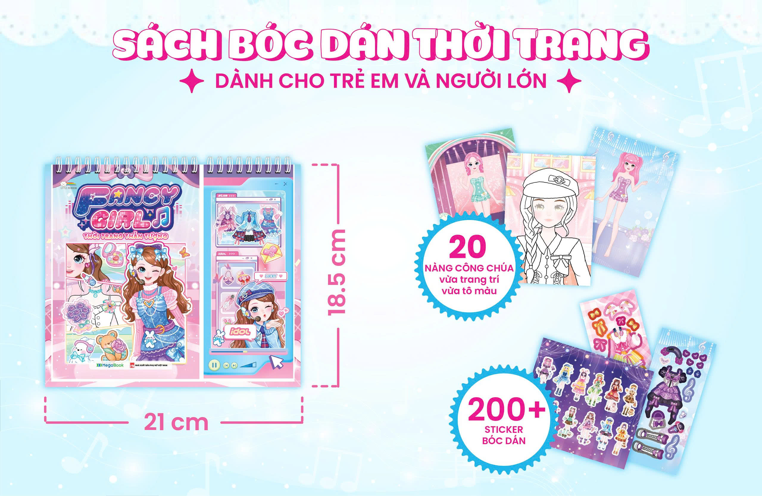 Fancy Girl - Thời trang thần tượng là cuốn sách bóc dán sticker thời trang được thiết kế dạng lò xo lật mở tiện lợi, cho phép trang hình công chúa, thần tượng idol và trang sticker luôn nằm cùng một mặt. Nhờ đó, các bé có thể dễ dàng vừa xem mẫu công chúa, vừa chọn sticker để phối đồ mà không cần lật trang liên tục. Với 20 nàng công chúa, thần tượng xinh xắn, hơn 200+ sticker thời trang các bé vừa thỏa sức bóc dán vừa thể hiện tài năng tô màu – phối màu sáng tạo cho các nàng công chúa, cuốn sách mở ra một thế giới thời trang mơ mộng, nơi bé tự do thể hiện gu thẩm mỹ và trí tưởng tượng của mình.