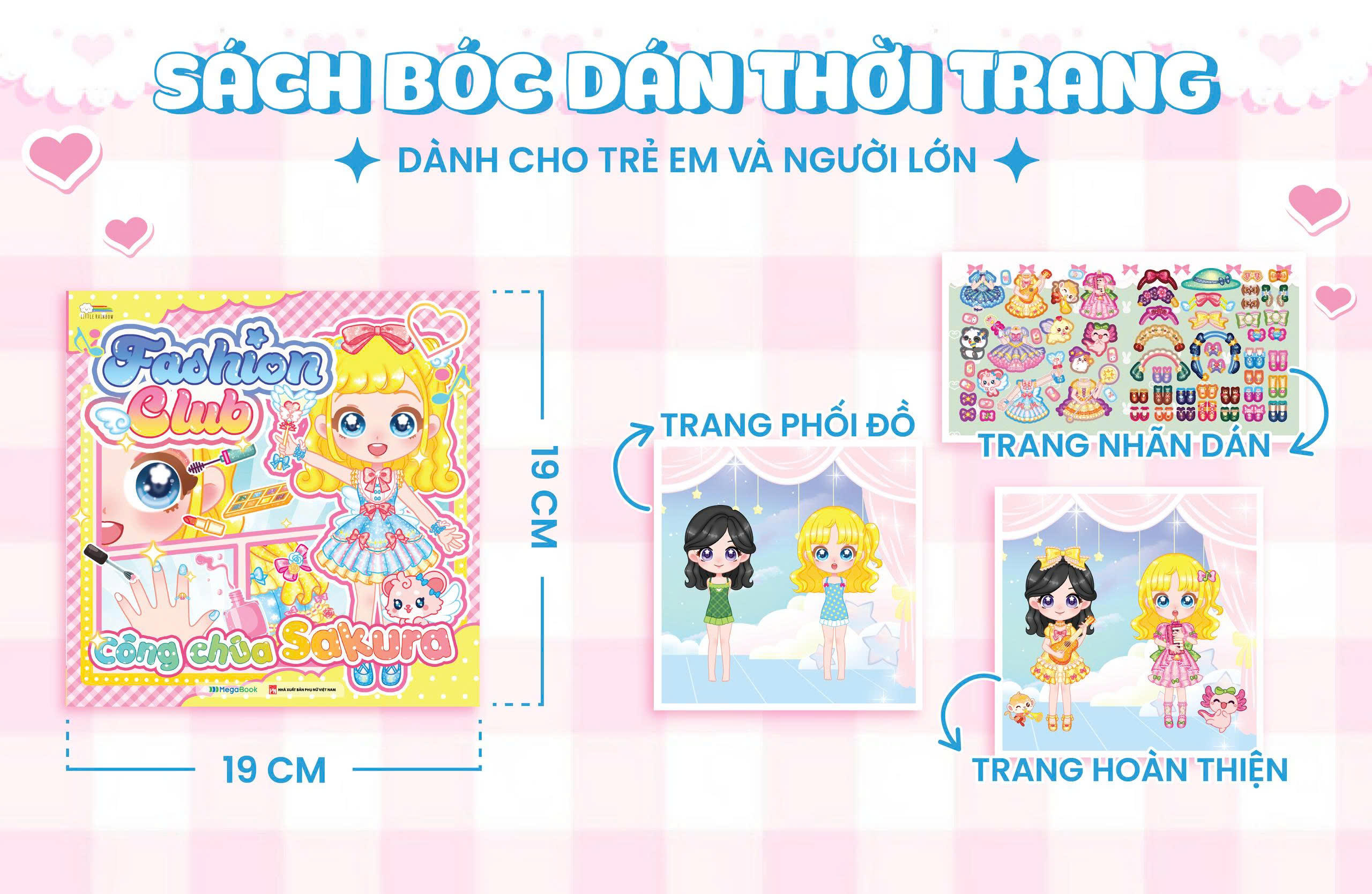 Bộ sách bóc dán Fashion Club gồm 3 cuốn: Công chúa Aki, Công chúa Sunny và Công chúa Sakura, mang đến thế giới thời trang đầy màu sắc cho các bé yêu làm đẹp. Mỗi cuốn có 18 nàng công chúa xinh xắn cùng 200+ sticker bóc dán đa dạng từ váy áo, giày dép, phụ kiện đến nail và trang sức. Bé có thể thỏa sức trang điểm, phối đồ và sáng tạo phong cách riêng cho từng công chúa, vừa chơi vừa khơi gợi trí tưởng tượng và gu thẩm mỹ ngay từ nhỏ.