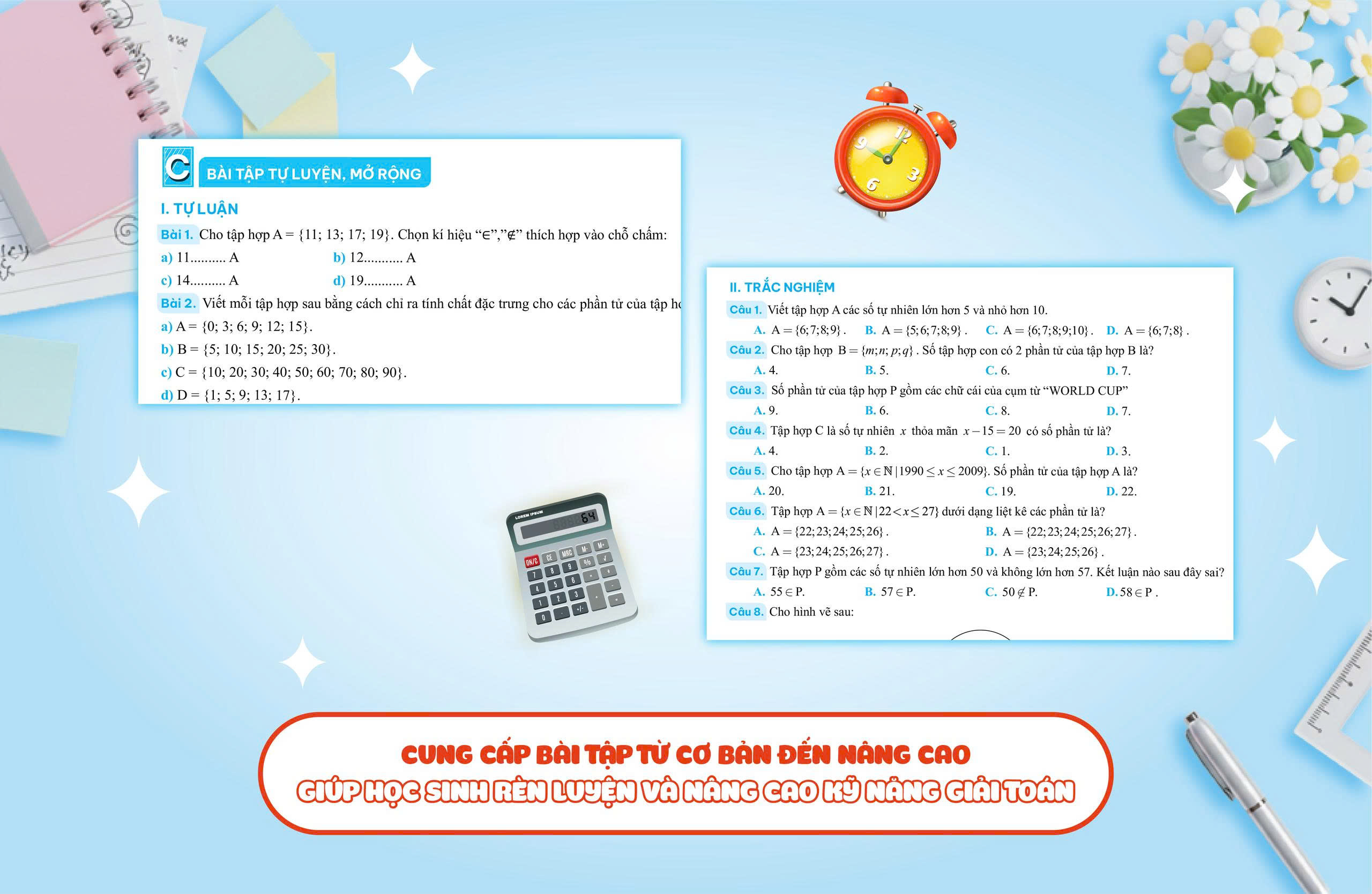 Bổ sung thêm bài tập tự luyện từ cơ bản đến nâng cao, mở rộng theo nội dung của mỗi bài học, giúp các em tự rèn luyện và trau dồi thành thục kỹ năng giải các dạng toán từ dễ đến khó.