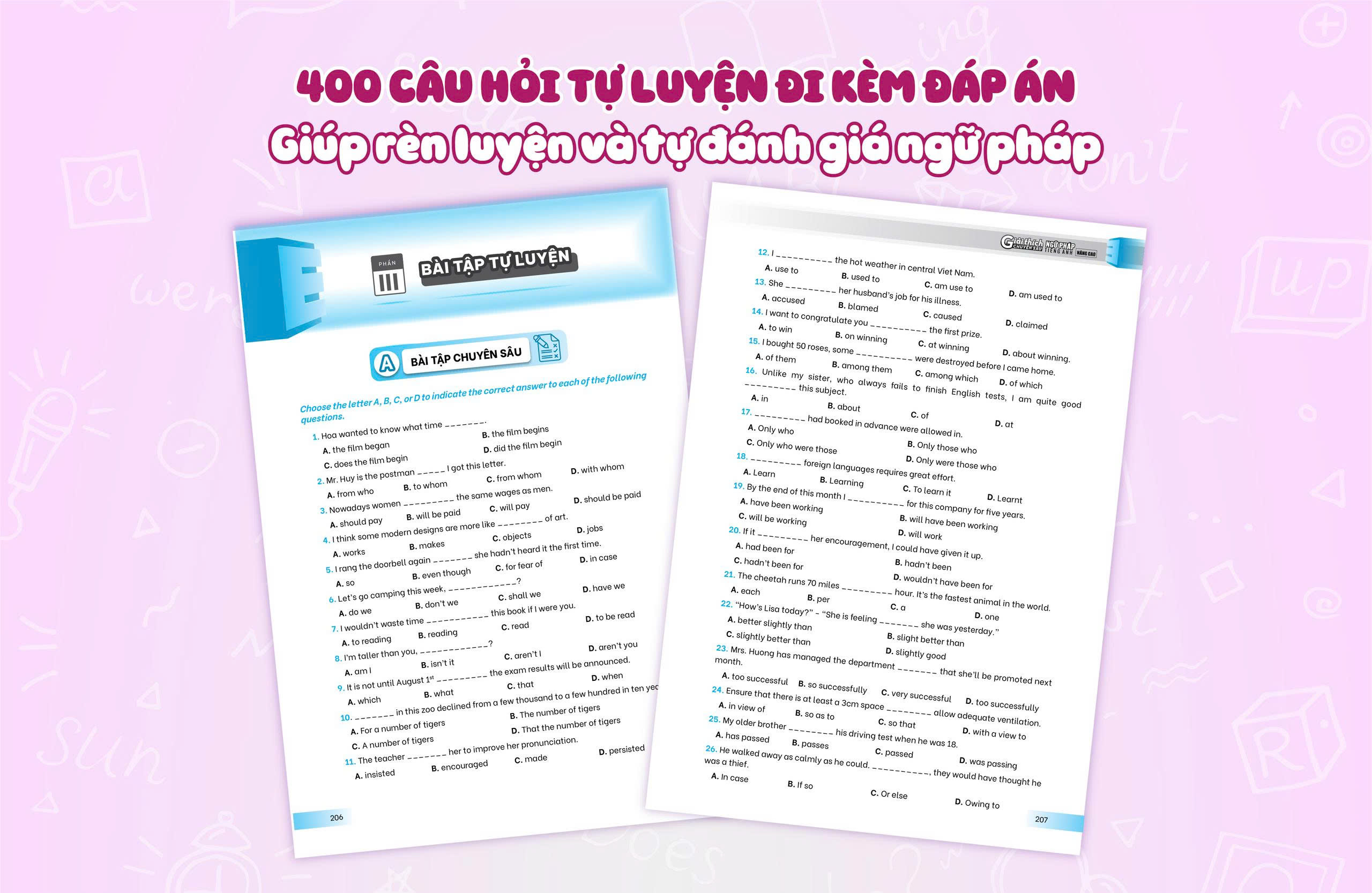 Cuốn sách cung cấp 600 câu hỏi trắc nghiệm với lời giải chi tiết, 300 câu hỏi luyện tập tổng hợp và 400 câu hỏi tự luyện. Điều này giúp học sinh có nhiều cơ hội thực hành và kiểm tra kiến thức, đảm bảo họ hiểu rõ ngữ pháp và có thể tự kiểm tra năng lực của mình.