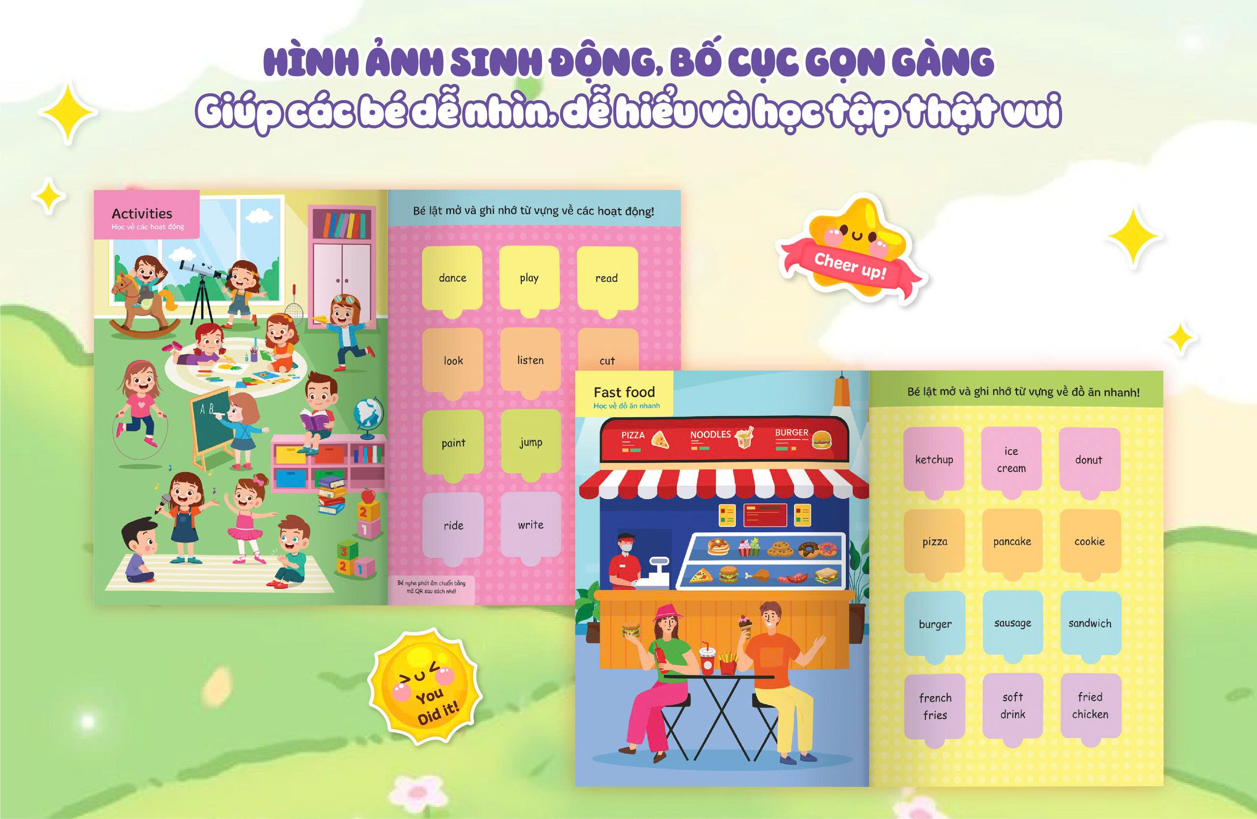 Mỗi cuốn sách đều có mã QR cho phép bạn quét và truy cập vào toàn bộ phần phát âm của từ vựng theo từng chủ đề. Bằng cách quét mã QR, trẻ em có thể nghe cách phát âm chính xác của từng từ vựng một cách trực quan và sinh động.