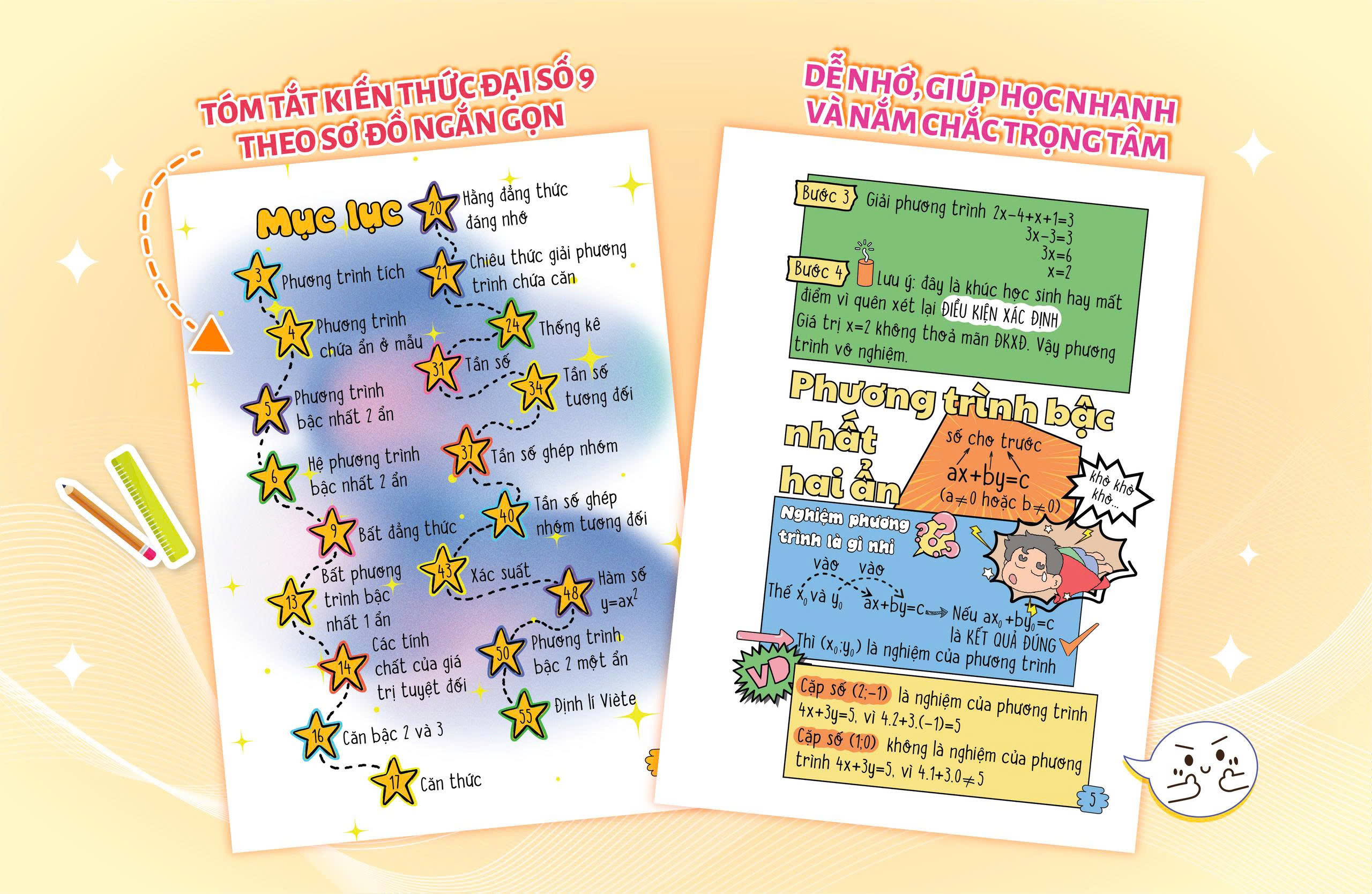 Note tốc độ - công thức Đại số Lớp 9 của Mr. Mất Gốc là cuốn sổ cứu cánh dành cho những bạn đang loay hoay với Toán Đại số. Với phong cách trình bày sặc sỡ, sinh động, cuốn sổ biến những công thức khô khan trở nên dễ hiểu, dễ nhớ và… dễ yêu hơn bao giờ hết. Nội dung bám sát chương trình mới, hệ thống từ cơ bản đến nâng cao, giúp các bạn học sinh lụm gốc nhanh chóng mà không bị quá tải. Vừa học vừa chill, càng học càng cuốn – đây chính là người bạn đồng hành lý tưởng cho hành trình chinh phục Đại số lớp 9.