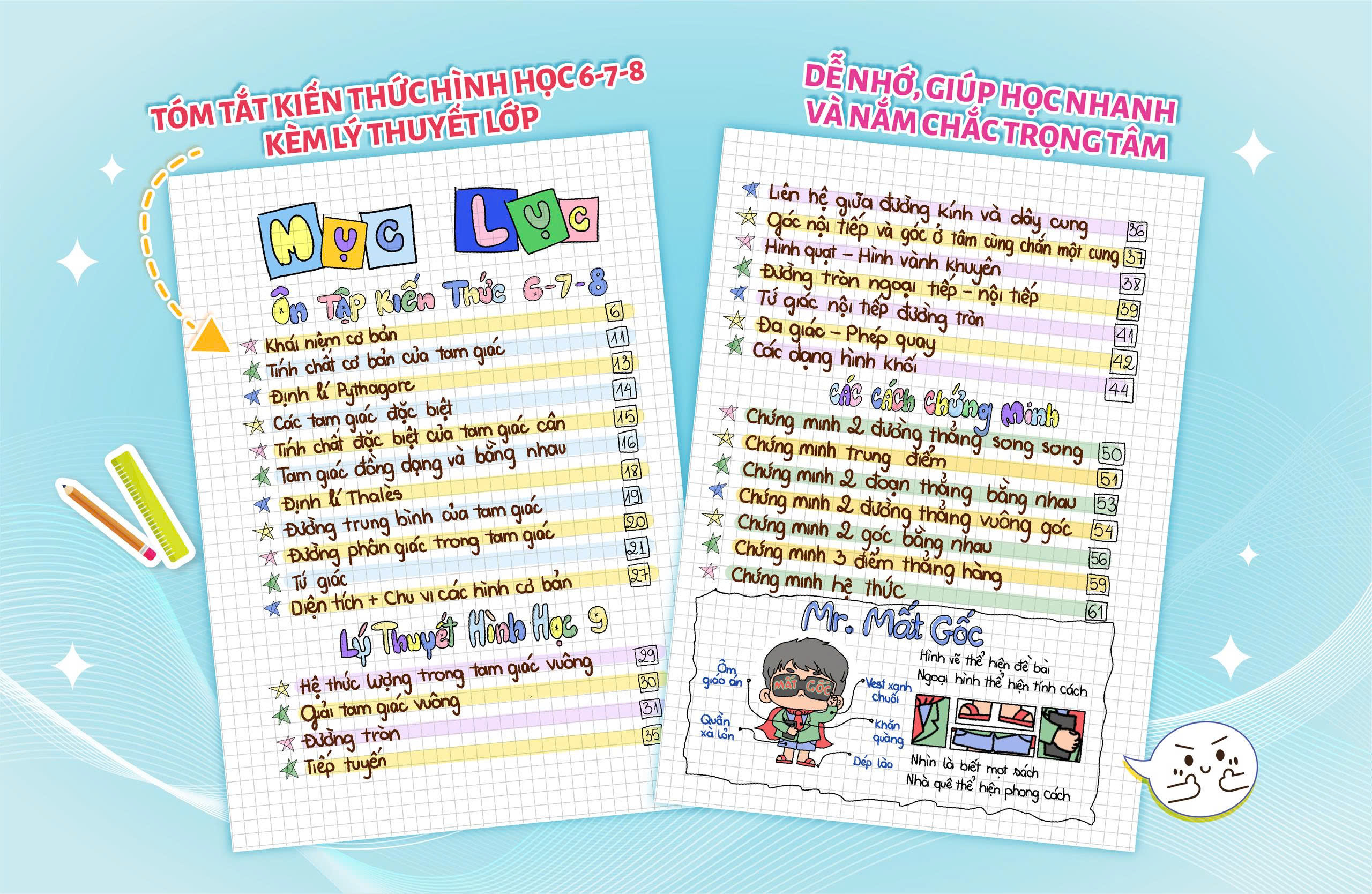 Note tốc độ - Công thức Hình THCS của Mr. Mất Gốc là cuốn sổ gỡ rối Hình học theo cách cực kỳ dễ thương và dễ hiểu. Toàn bộ kiến thức được trình bày bằng hình vẽ sinh động, màu sắc bắt mắt, giúp biến những định lý và công thức tưởng chừng khó nhằn trở nên gần gũi hơn. Nội dung bám sát chương trình THCS, đi từ cơ bản đến nâng cao, hỗ trợ học sinh lấy lại gốc nhanh chóng. Với tinh thần vừa học vừa chill, cuốn sổ mang đến trải nghiệm học nhẹ nhàng, không áp lực mà vẫn hiệu quả.