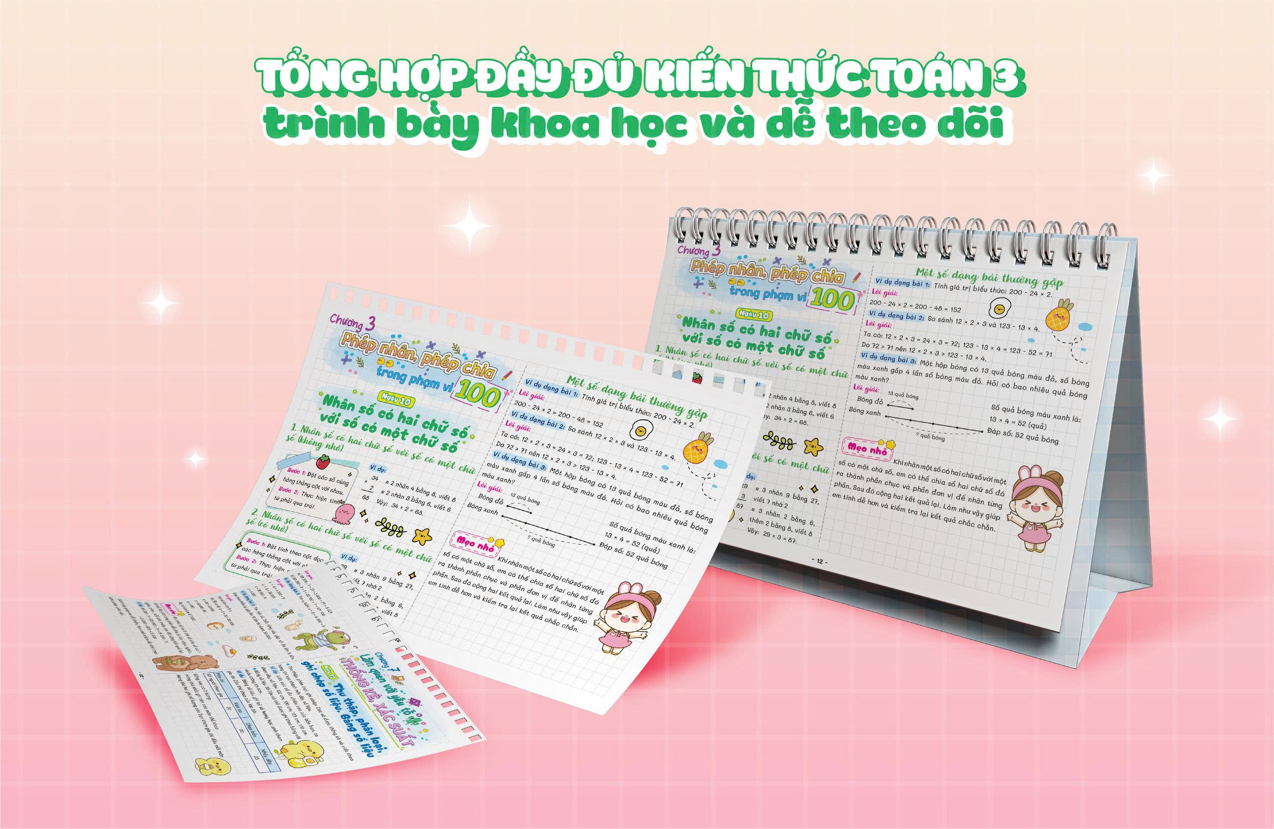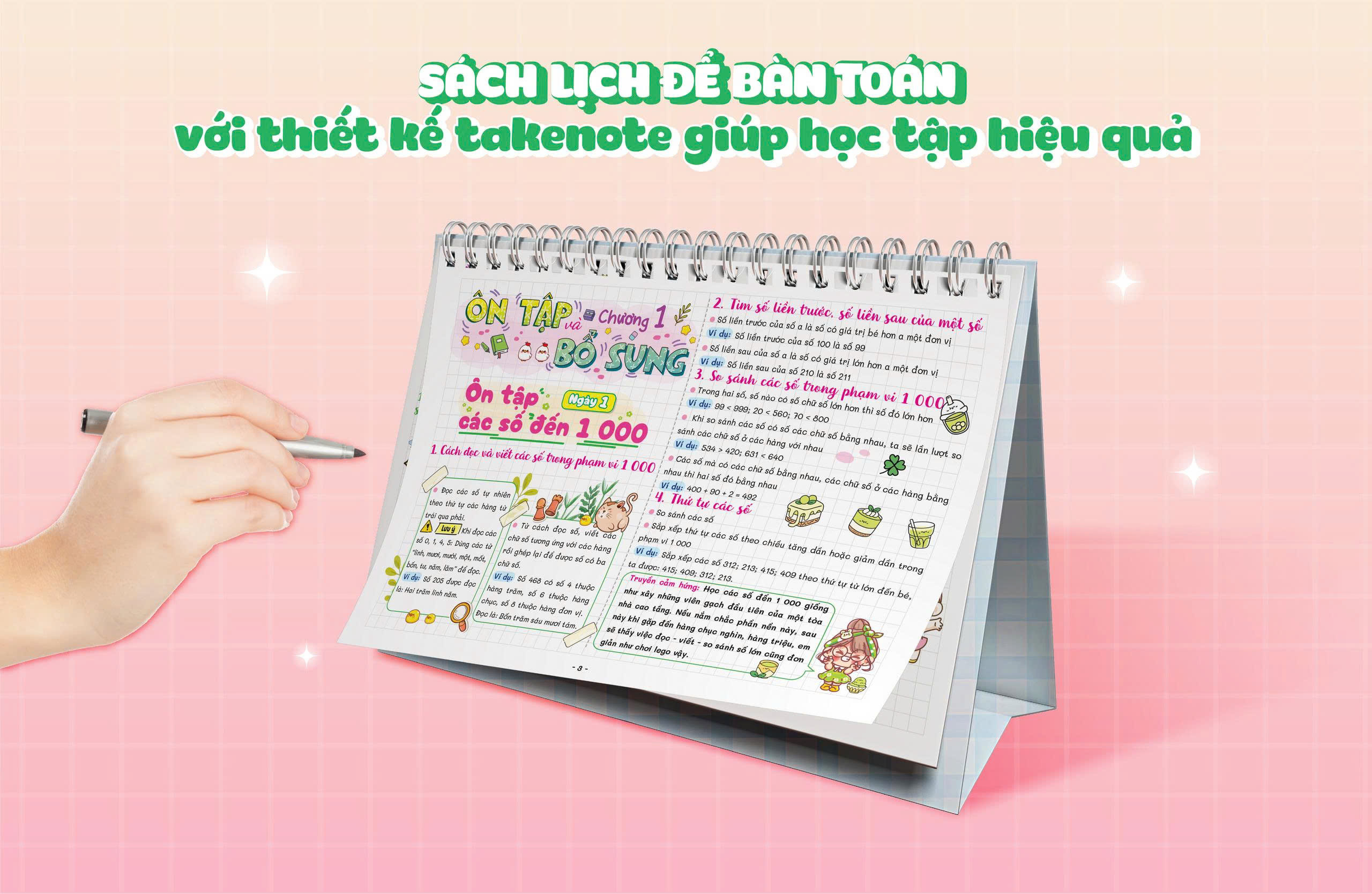 Sách Lịch Để Bàn – Tra Cứu Nhanh Kiến Thức Hàng Ngày Toán lớp 3 nằm trong bộ Sách Lịch Để Bàn – Tra Cứu Nhanh Kiến Thức Hàng Ngày Toán Tiểu học là trợ thủ học tập thông minh dành cho học sinh lớp 3. Thiết kế dạng lịch để bàn độc đáo, trình bày theo phong cách takenote khoa học, giúp các bạn nhỏ dễ theo dõi kiến thức từng bài, từng chương. Mỗi trang đều ngắn gọn – trọng tâm – dễ nhớ, hỗ trợ tự học hiệu quả và ôn thi nhanh chóng. Thiết kế xinh xắn nhưng vẫn đầy đủ kiến thức trọng tâm chuẩn chương trình mới, giúp học sinh chinh phục điểm cao một cách nhẹ nhàng.