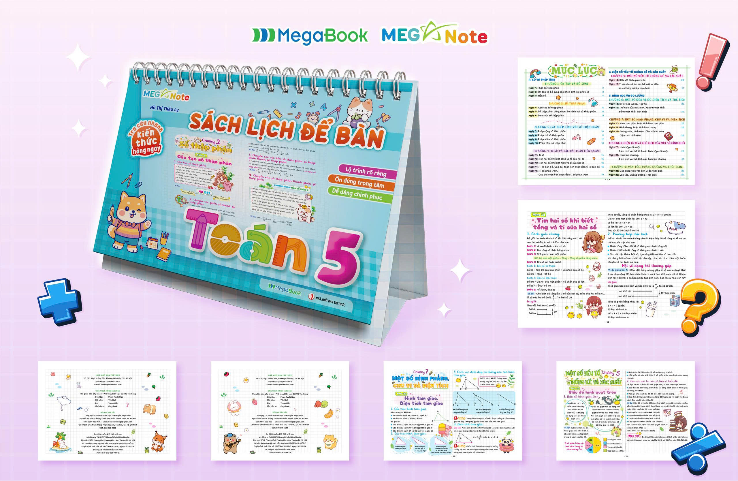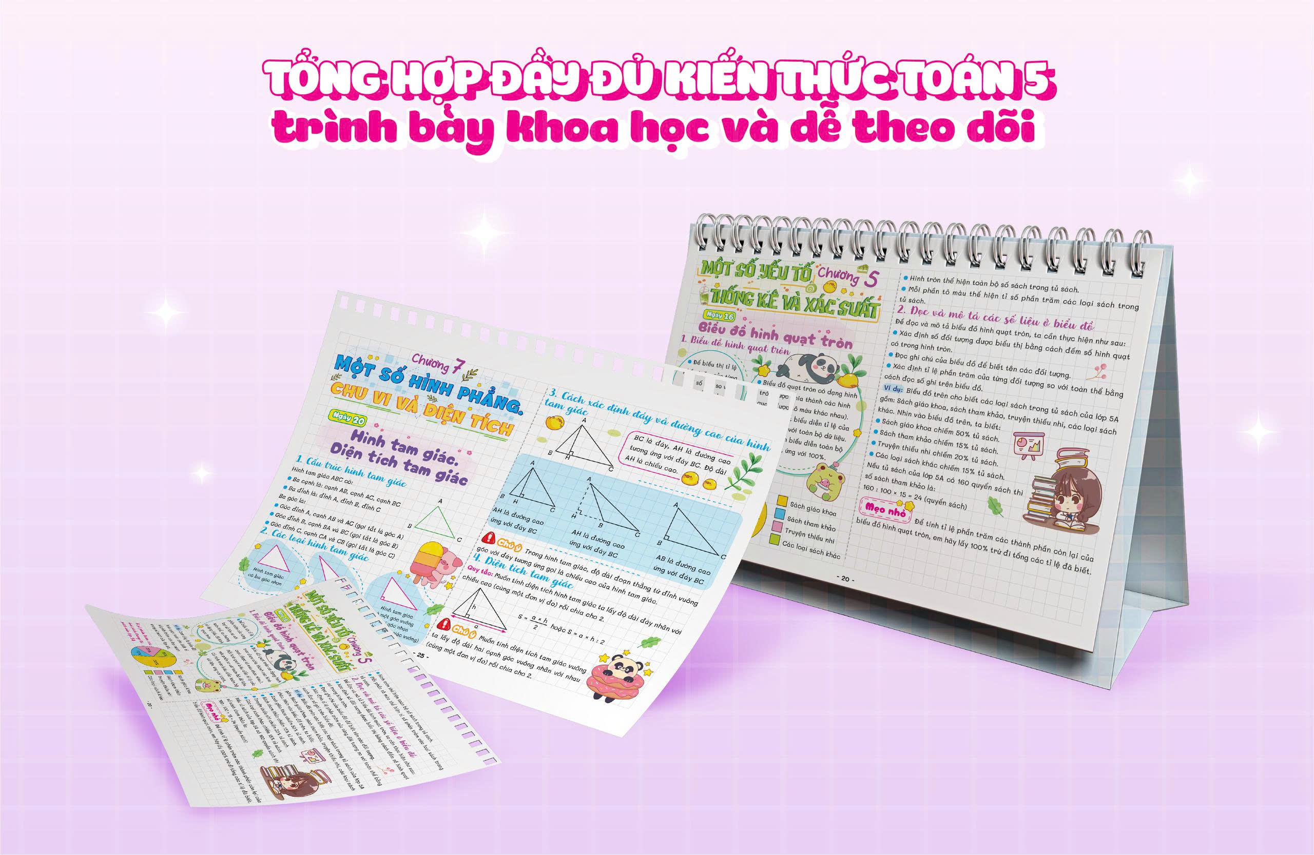 Sách Lịch Để Bàn – Tra Cứu Nhanh Kiến Thức Hàng Ngày Toán lớp 5 nằm trong bộ Sách Lịch Để Bàn – Tra Cứu Nhanh Kiến Thức Hàng Ngày Toán Tiểu học là trợ thủ học tập thông minh dành cho học sinh lớp 5. Thiết kế dạng lịch để bàn độc đáo, trình bày theo phong cách takenote khoa học, giúp các bạn nhỏ dễ theo dõi kiến thức từng bài, từng chương. Mỗi trang đều ngắn gọn – trọng tâm – dễ nhớ, hỗ trợ tự học hiệu quả và ôn thi nhanh chóng. Thiết kế xinh xắn nhưng vẫn đầy đủ kiến thức trọng tâm chuẩn chương trình mới, giúp học sinh chinh phục điểm cao một cách nhẹ nhàng.