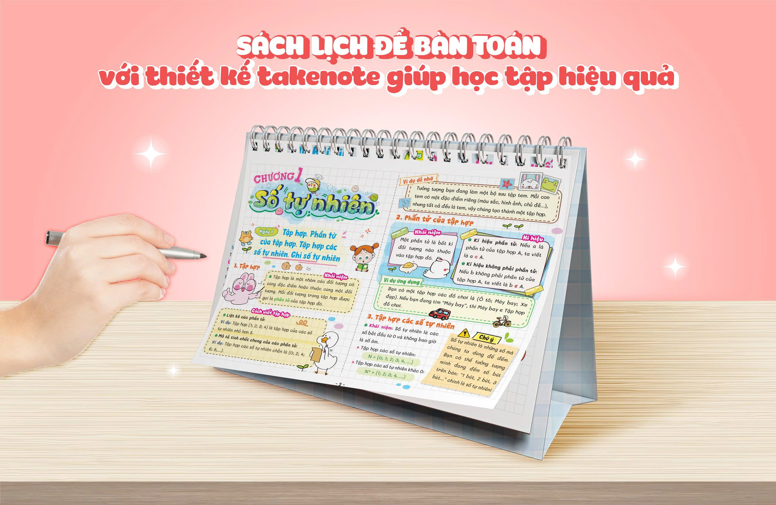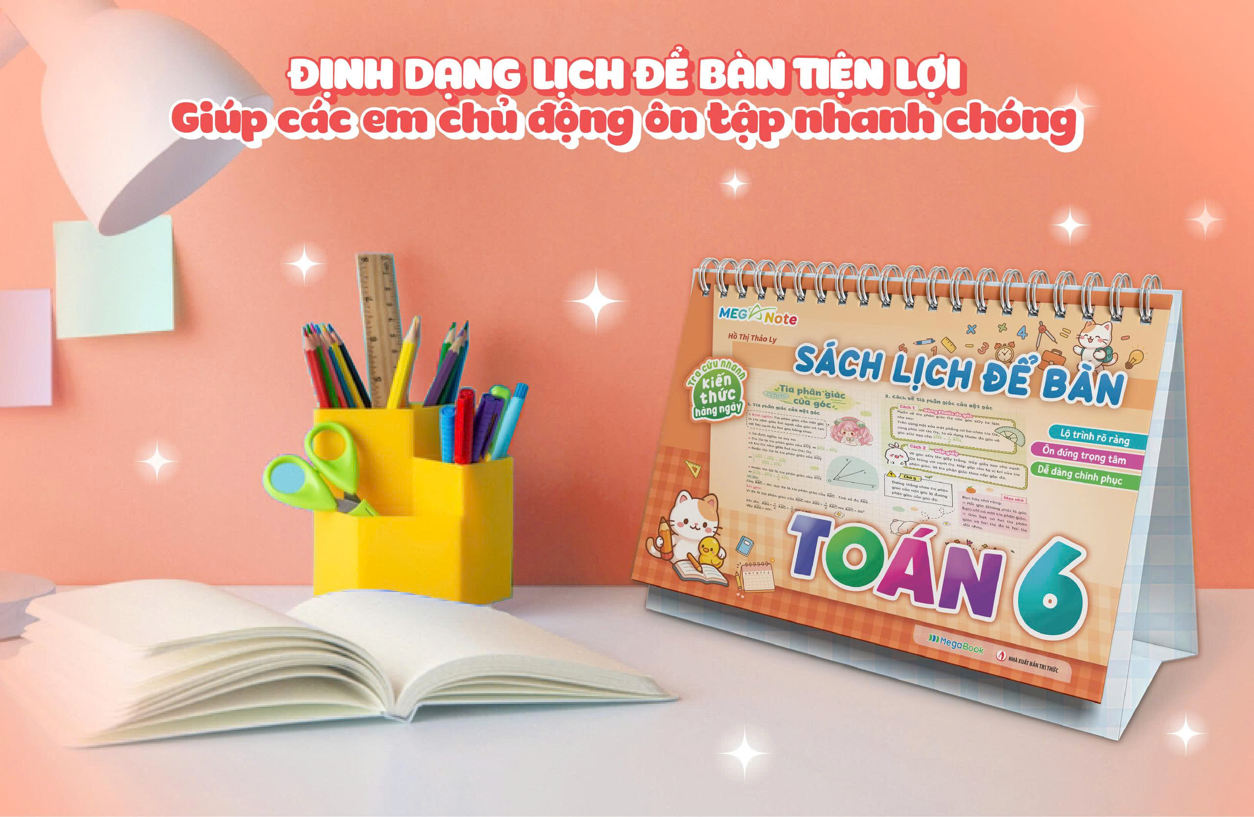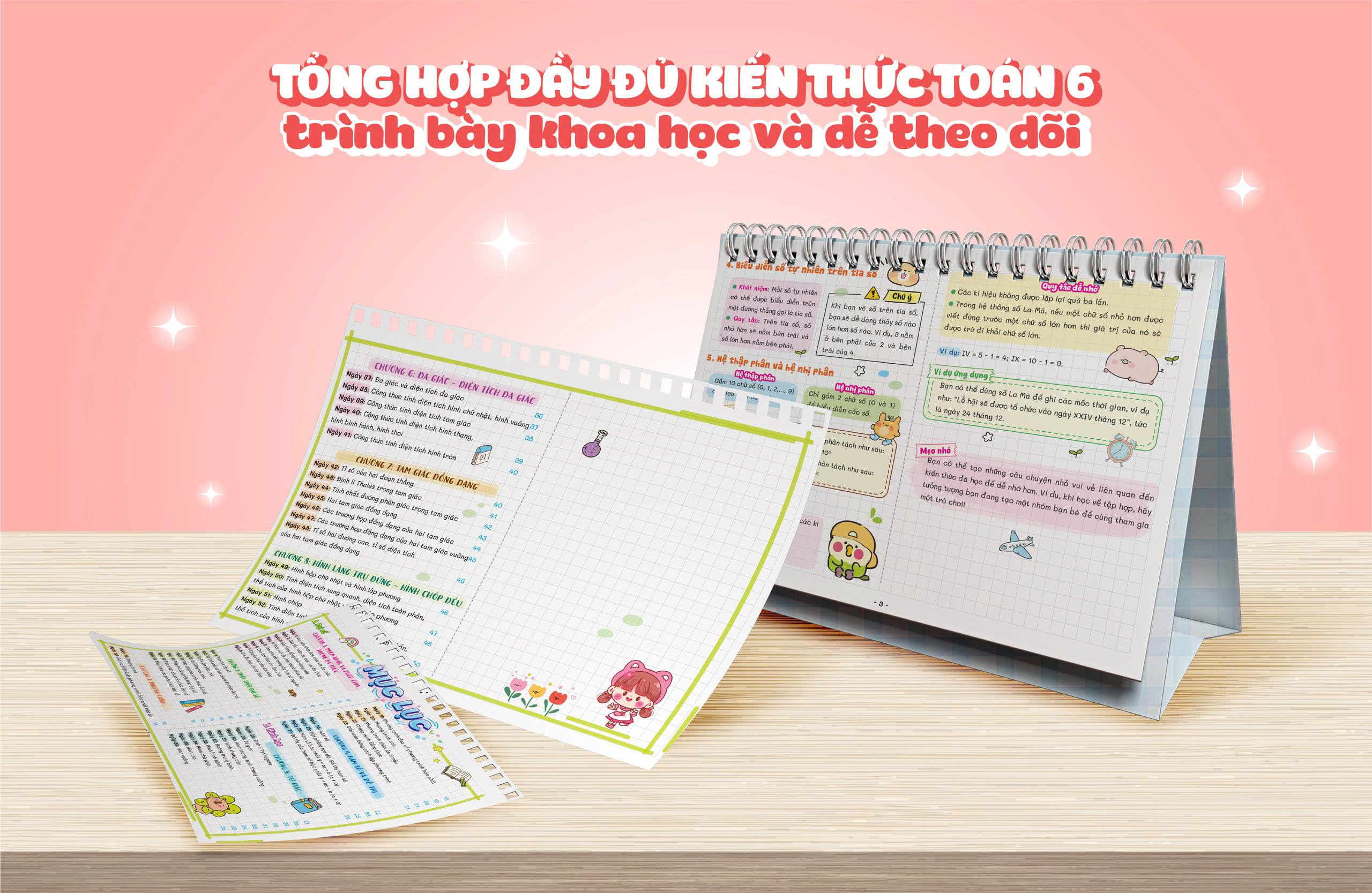 Sách Lịch Để Bàn – Tra Cứu Nhanh Kiến Thức Hàng Ngày Toán lớp 6 nằm trong bộ Sách Lịch Để Bàn – Tra Cứu Nhanh Kiến Thức Hàng Ngày Toán THCS là trợ thủ học tập thông minh dành cho học sinh lớp 6. Thiết kế dạng lịch để bàn độc đáo, trình bày theo phong cách takenote khoa học, giúp các bạn nhỏ dễ theo dõi kiến thức từng bài, từng chương. Mỗi trang đều ngắn gọn – trọng tâm – dễ nhớ, hỗ trợ tự học hiệu quả và ôn thi nhanh chóng. Thiết kế xinh xắn nhưng vẫn đầy đủ kiến thức trọng tâm chuẩn chương trình mới, giúp học sinh chinh phục điểm cao một cách nhẹ nhàng.