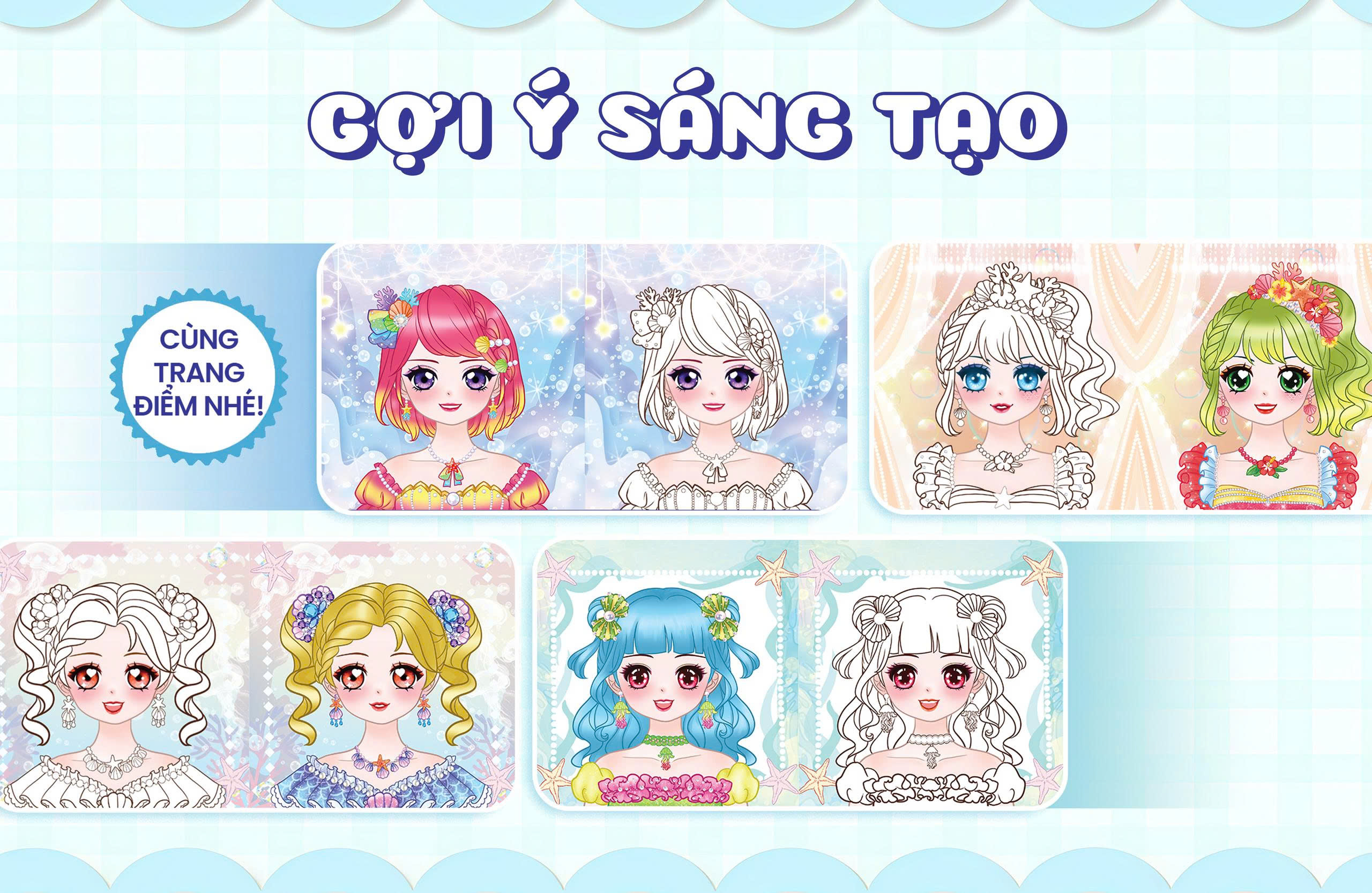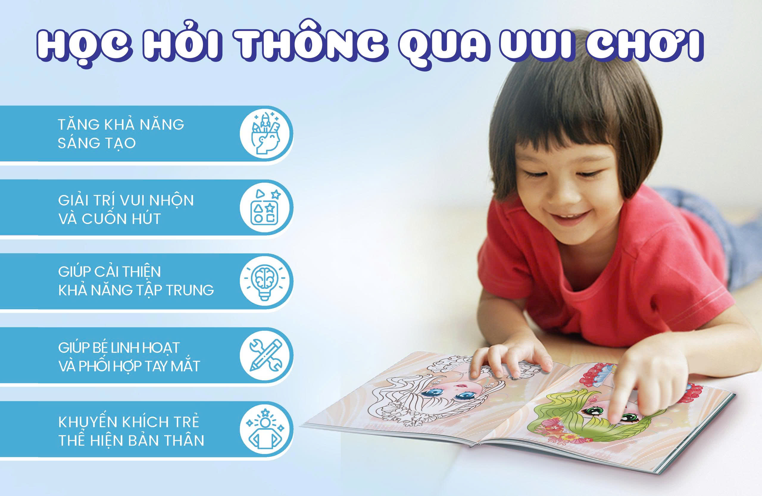Giúp các bé có thể chơi bóc dán trang điểm một cách chân thực, đẹp nhất. Các bé có thể thỏa sức sáng tạo với 24 hình công chúa. Đặc biệt hơn là vừa bóc dán trang điểm, vừa tô màu để biến hóa công chúa trở nên xinh đẹp hơn