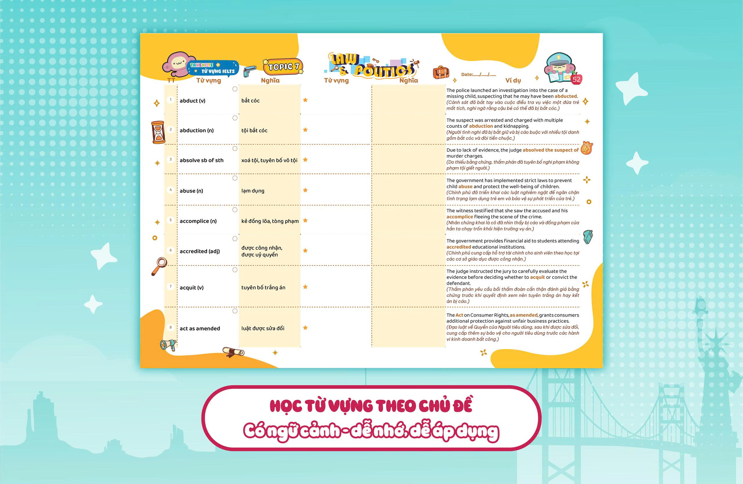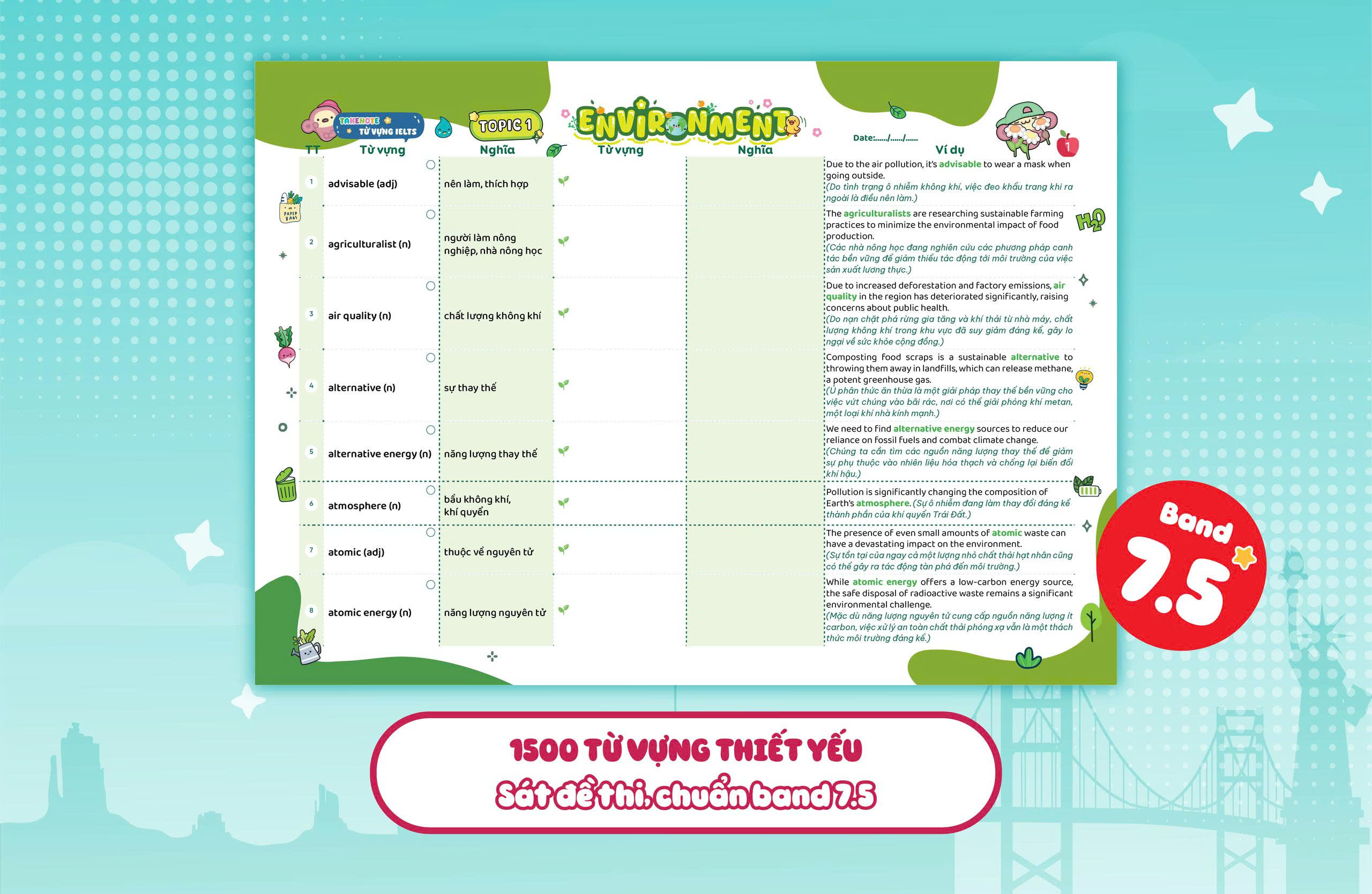 TAKENOTE - Từ vựng IELTS cung cấp 1500 từ vựng band 7.5 theo chủ đề được chọn lọc kỹ lưỡng theo 7 chủ đề học thuật trọng tâm, sát với cấu trúc và xu hướng đề thi thực tế. Nội dung được thiết kế khoa học, logic, giúp người học không chỉ ghi nhớ từ mới hiệu quả mà còn hiểu cách vận dụng trong ngữ cảnh học thuật qua các ví dụ được chọn lọc kỹ lưỡng, từ đó nâng cao tư duy ngôn ngữ và khả năng diễn đạt trong bài thi IELTS.