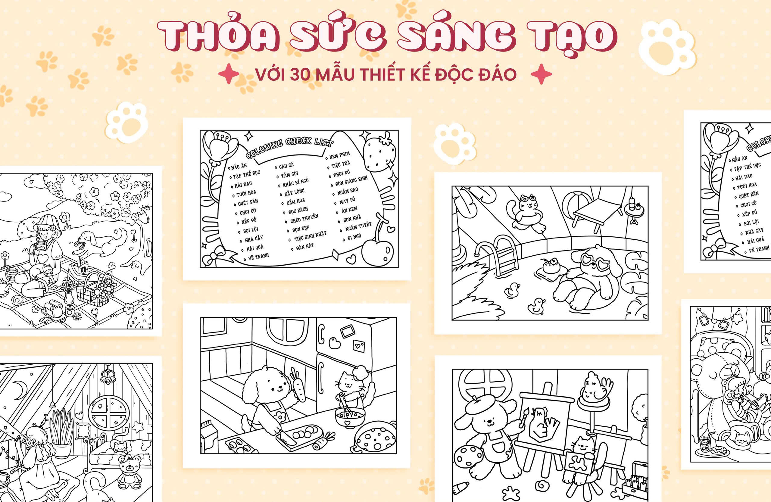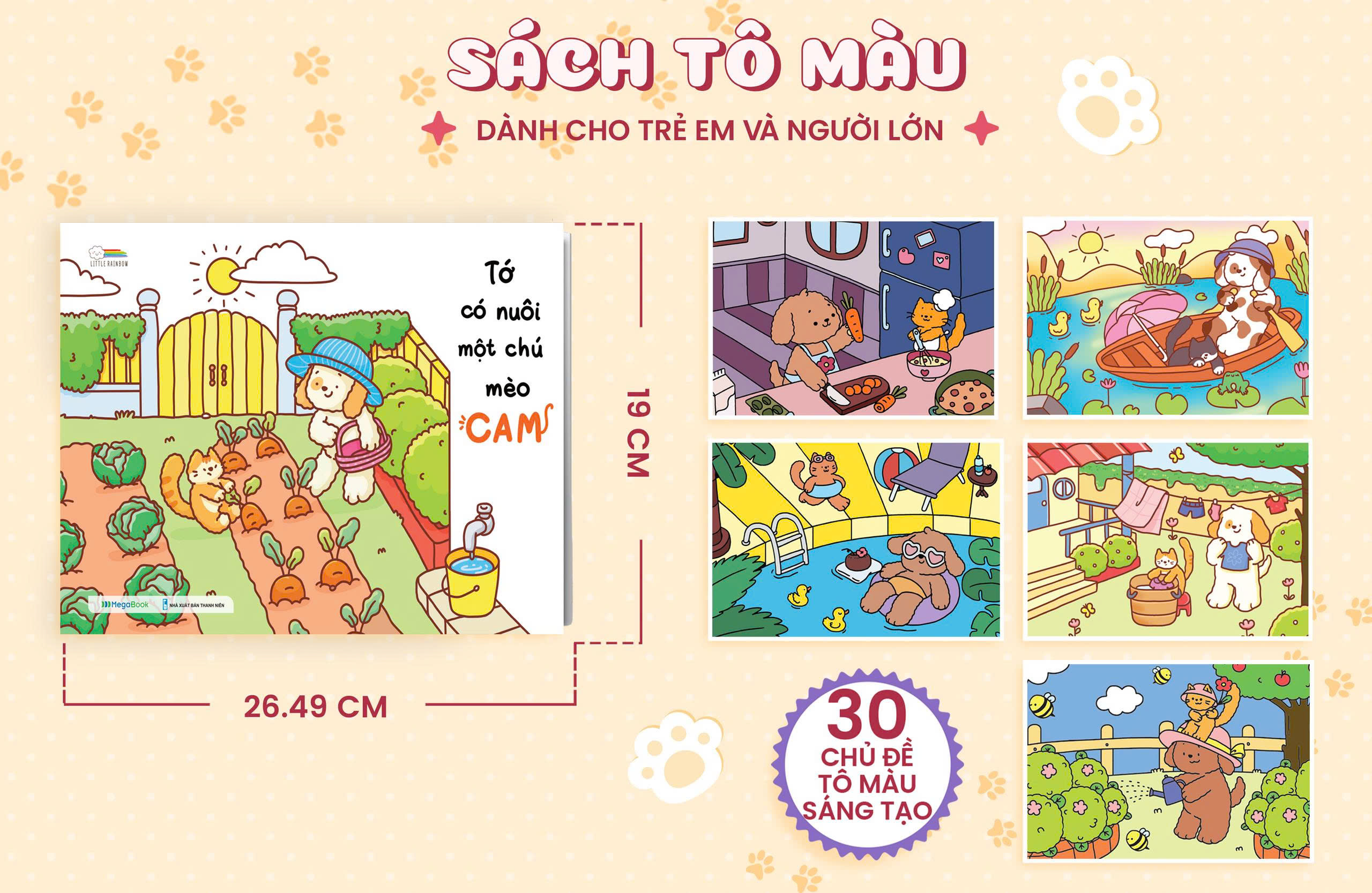 - Với 30 chủ đề tô màu phong phú đa dạng, mỗi bức tranh là một hoạt động hàng ngày cùng với chú mèo Cam