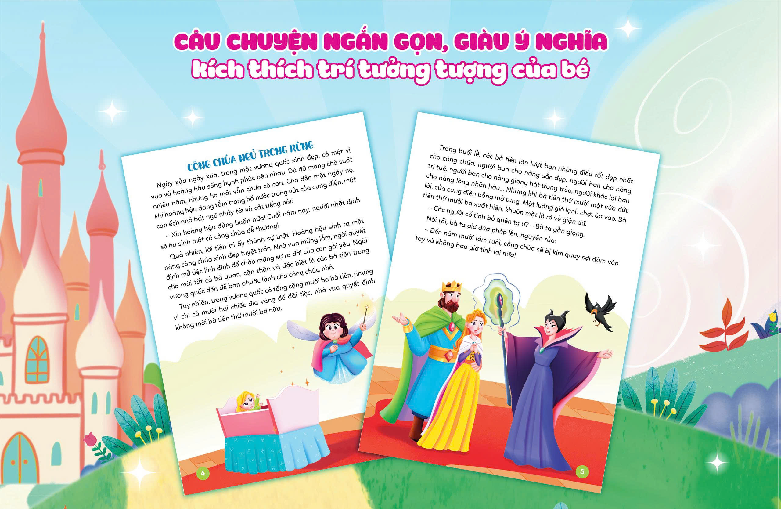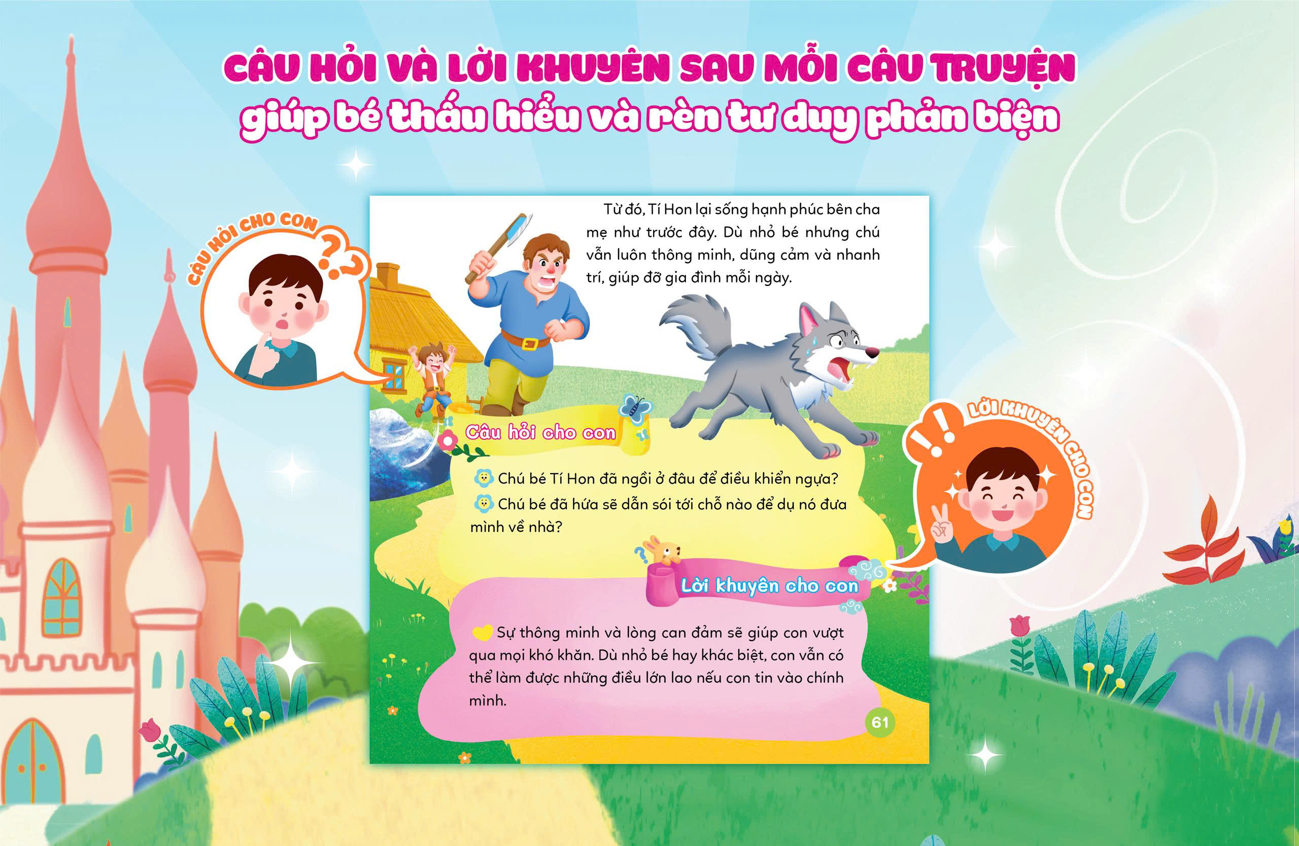 Mỗi truyện cổ tích đều được chắt lọc và gợi mở qua “Câu hỏi cho con” và “Lời khuyên cho con”, giúp bé rèn tư duy phản biện, hiểu được điều đúng sai, thiện ác.