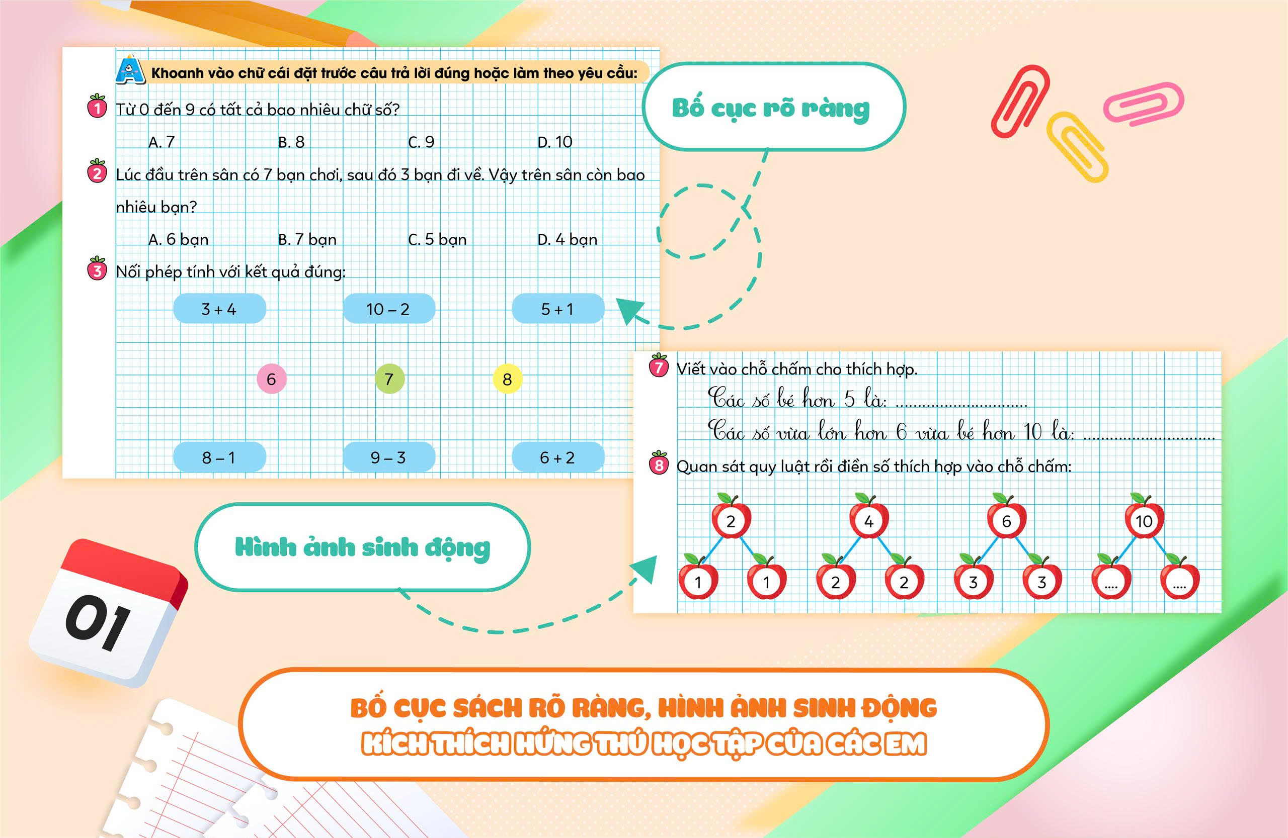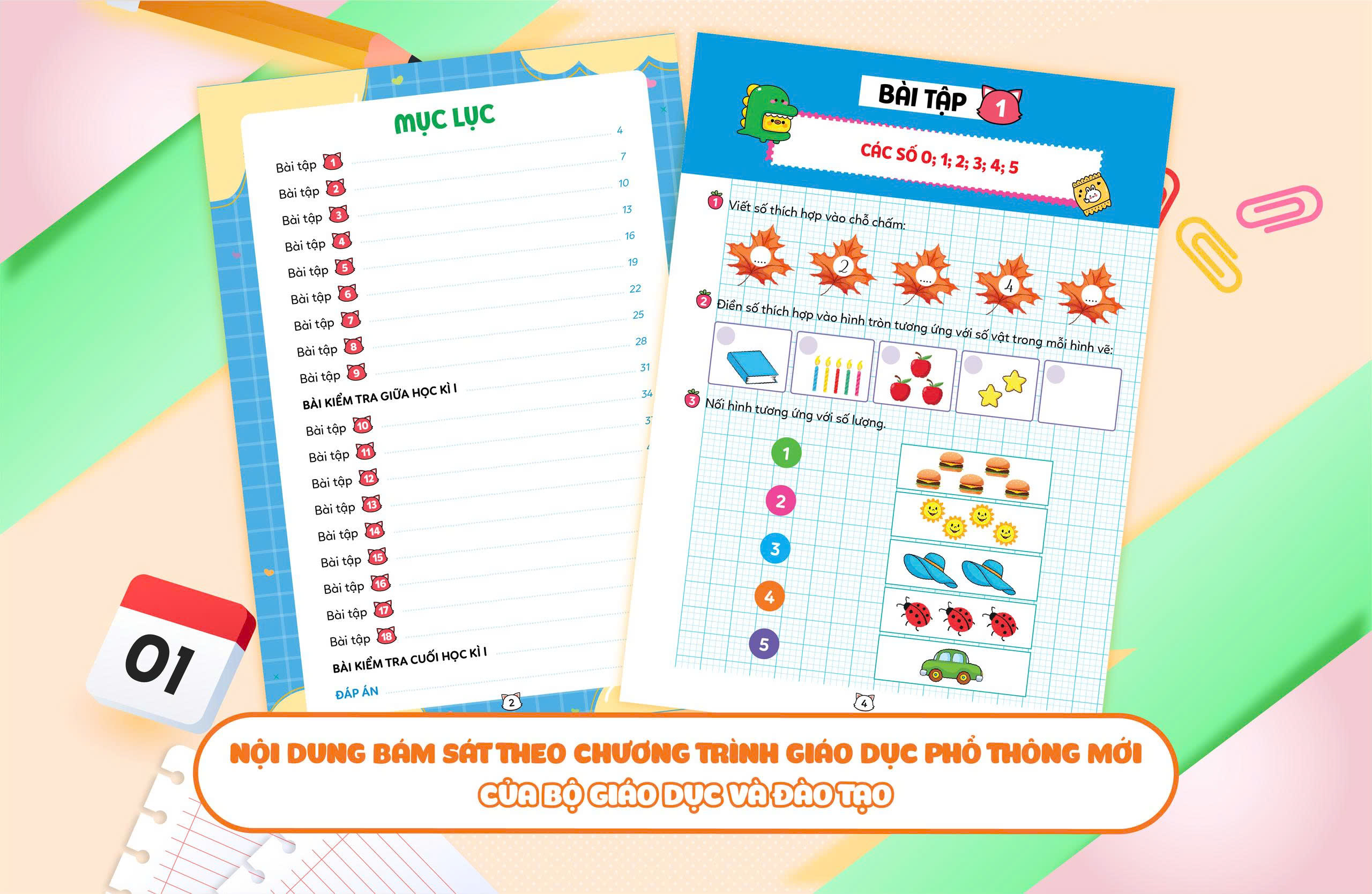 Vở bài tập Toán tăng cường lớp 1 tập 1 là tài liệu hữu ích giúp học sinh lớp 1 củng cố kiến thức Toán học một cách hiệu quả. Sách được biên soạn theo chương trình Giáo dục phổ thông mới của Bộ Giáo dục và Đào tạo. Cuốn sách này không chỉ cung cấp bài tập đa dạng mà còn bám sát chương trình học trên lớp. Bộ sách gồm tập 1 và tập 2, các em sẽ dễ dàng ôn tập và chuẩn bị cho các bài kiểm tra giữa kì và cuối kì. Đây thực sự là một người bạn đồng hành lý tưởng cho hành trình học toán của các em.